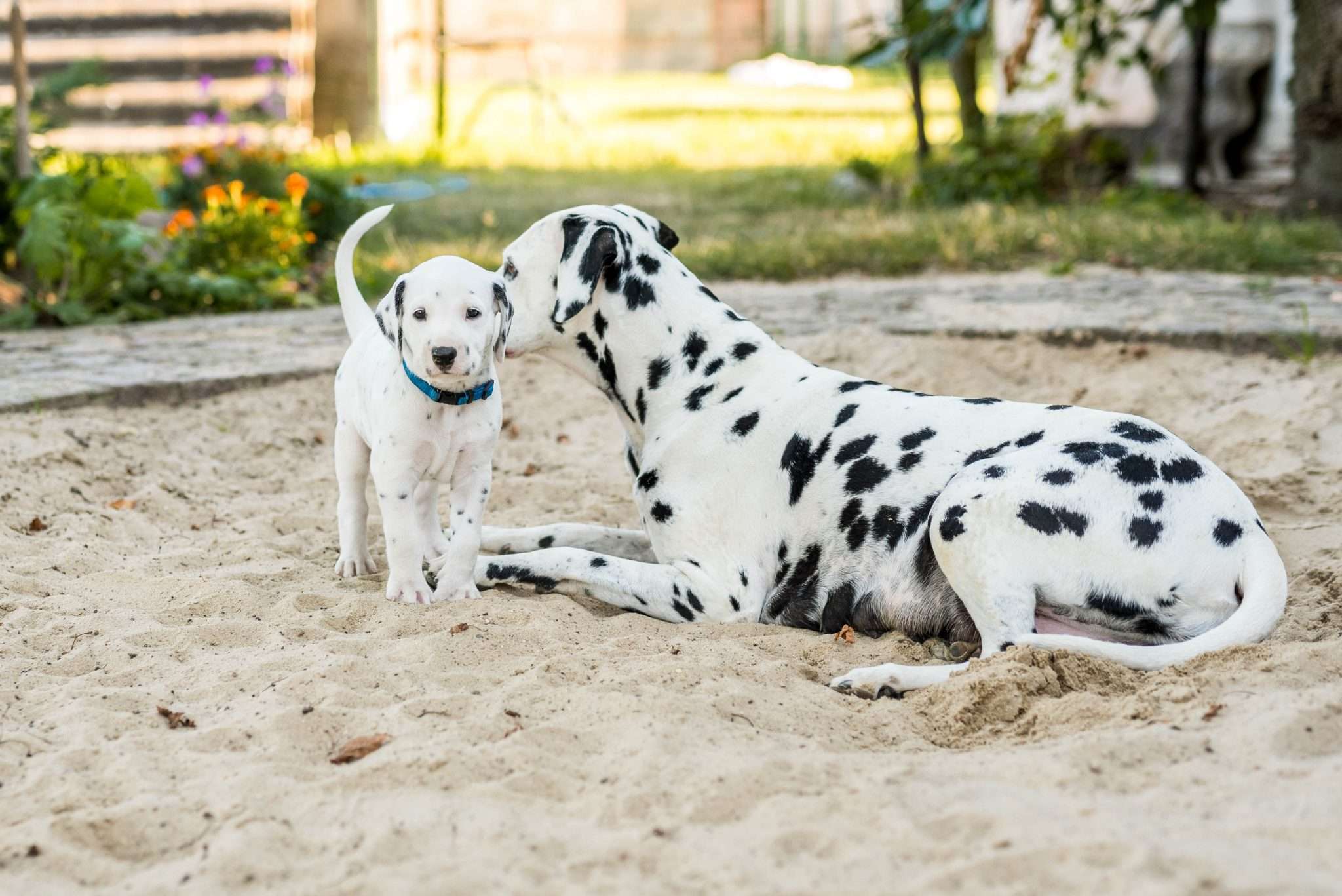 Nachdem die Speckies also den halben Tag gepennt hatten, lediglich von den Unterbrechungen zum Essen – was für ein Leben! – waren sie auf den späten Nachmittag ausgeschlafen und bereit für Abenteuer. Es ging einzeln in den Garten zum großen Sandkasten, einer der Lieblingsplätze von Alva, besonders an warmen Tagen. Im Welpenreich steht zwar eine gefüllte Schale, genutzt wird sie allerdings wenig, deshalb dachte ich mir, es wäre endlich Zeit für Sand zwischen den Pfoten. Alle haben das prima gemacht! Keiner war zurückhaltend oder ängstlich, ist geflüchtet oder erstarrt. Die meisten hat es gar nicht interessiert, viel spannender war Mama oder alles ringsherum.