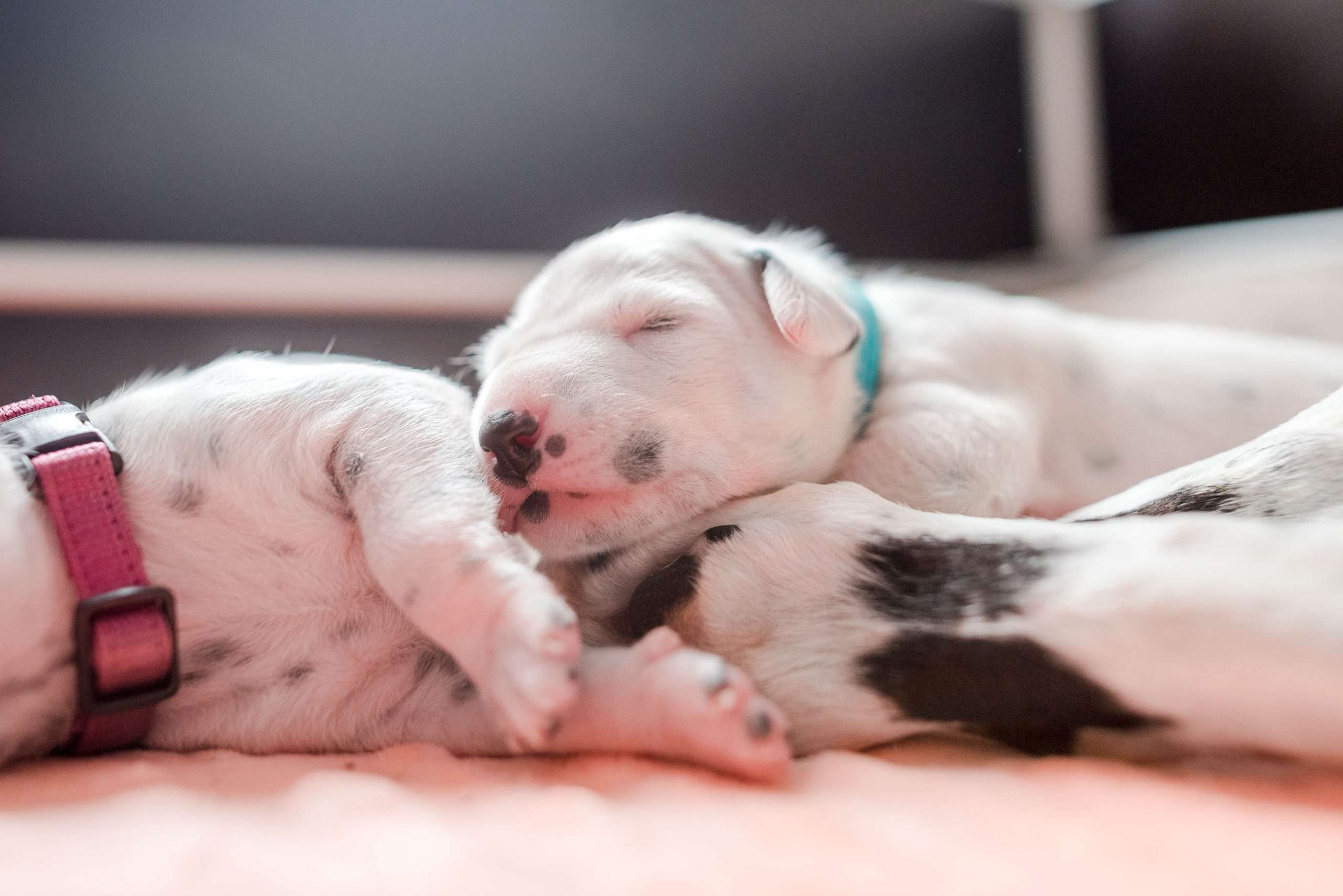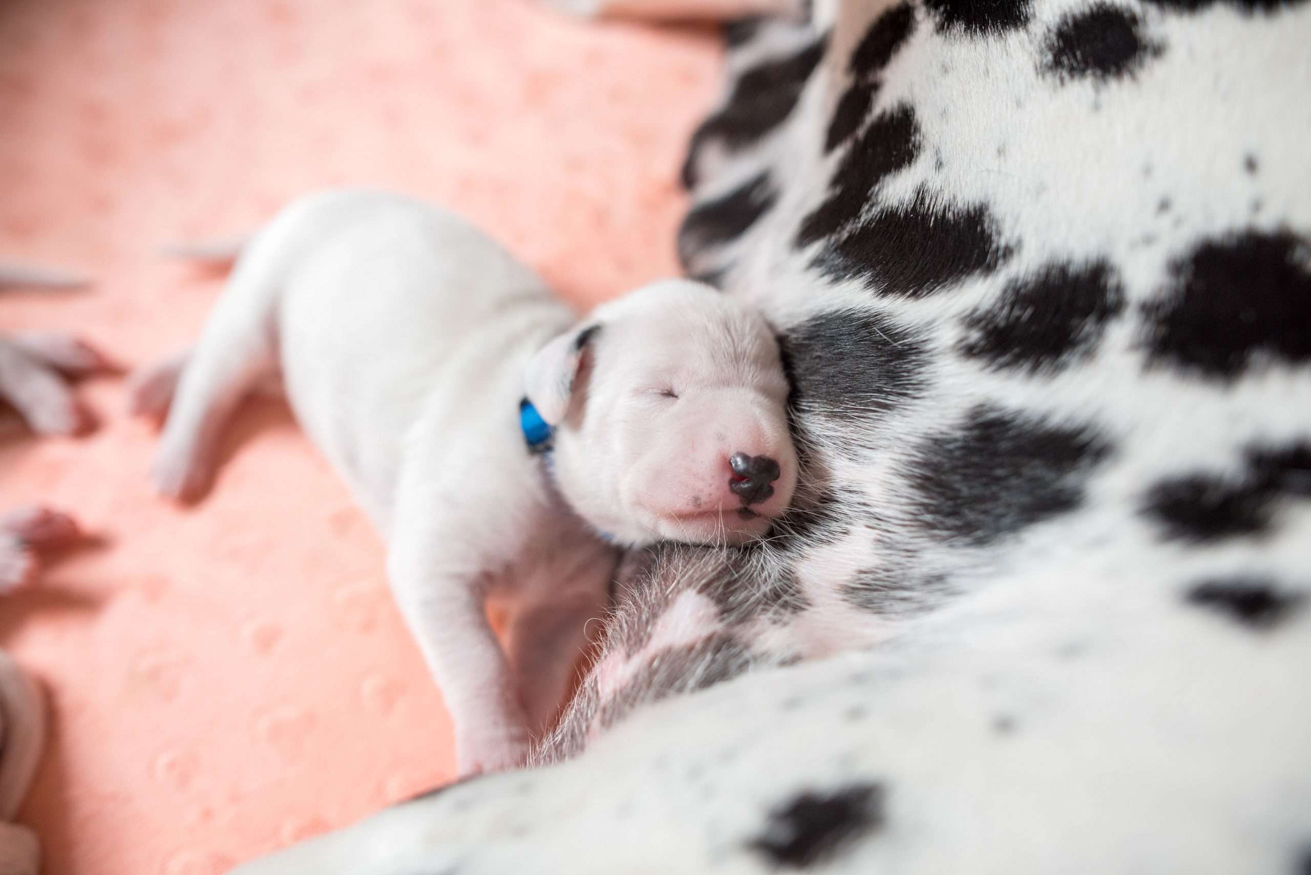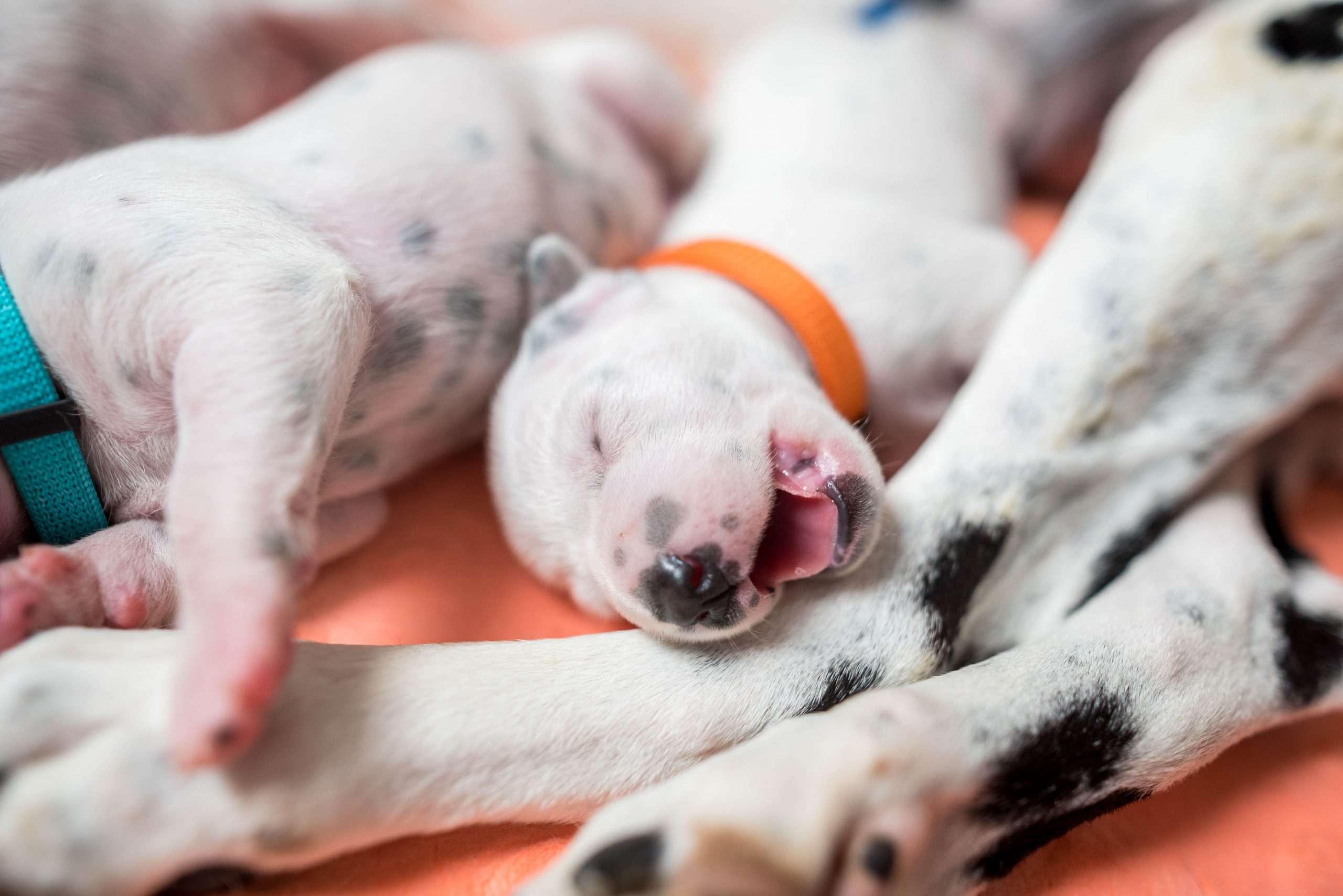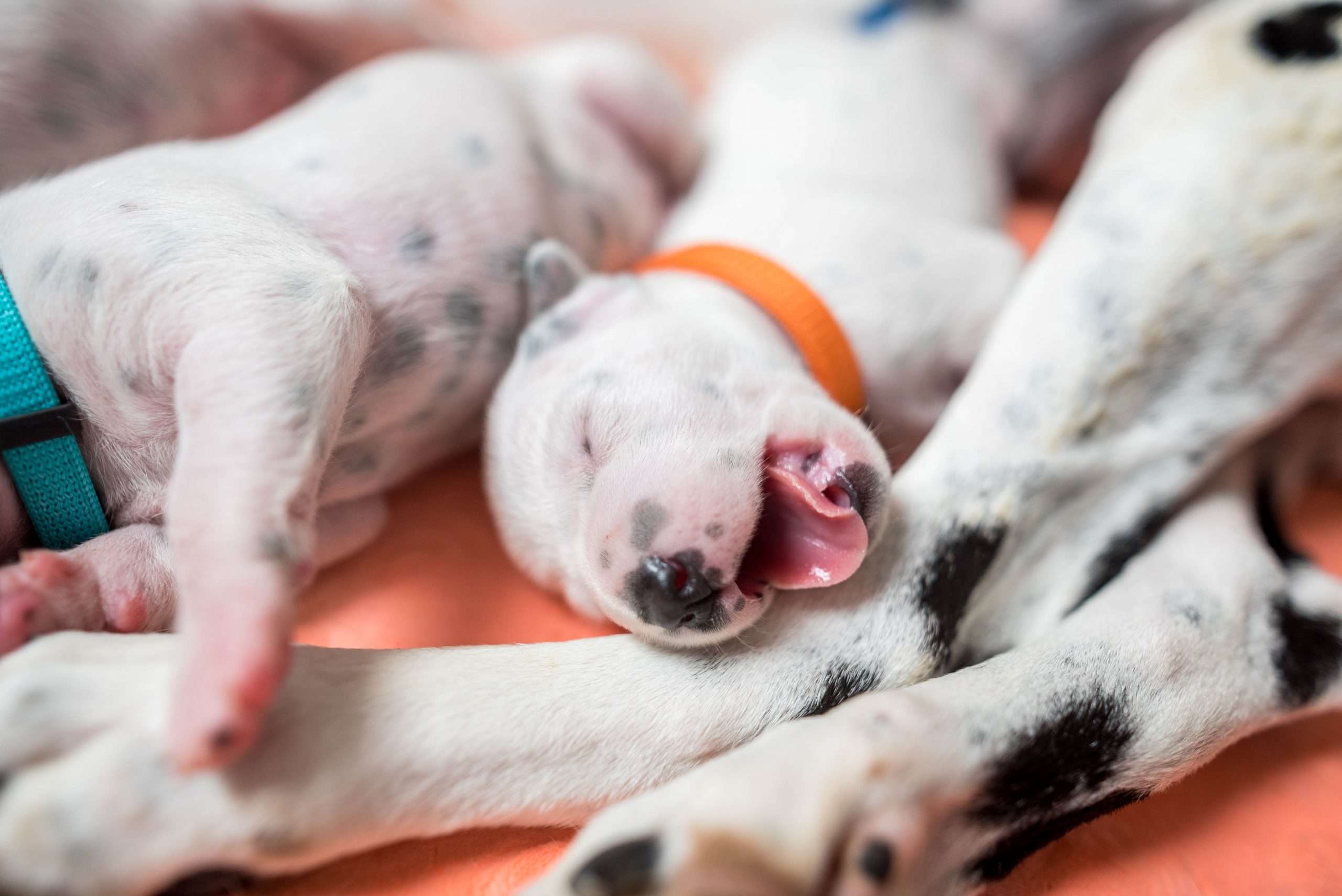Hach, Welpe müsste man sein. Mit dickem Kugelbauch im Milchkoma satt und zufrieden schlummern. Es ist zuckersüß zu sehen, wie es in der ganzen Wurfbox zuckt und wackelt, hier mal ein Beinchen, da mal ein Öhrchen und ganz viel verträumtes Nuckeln. Und erst diese Geräusche dazu! Und diese kleinen heraushängenden Zungen. Zu goldig!