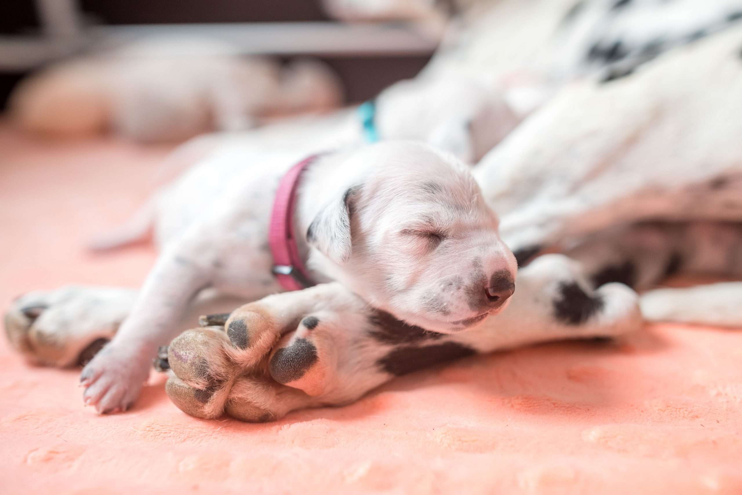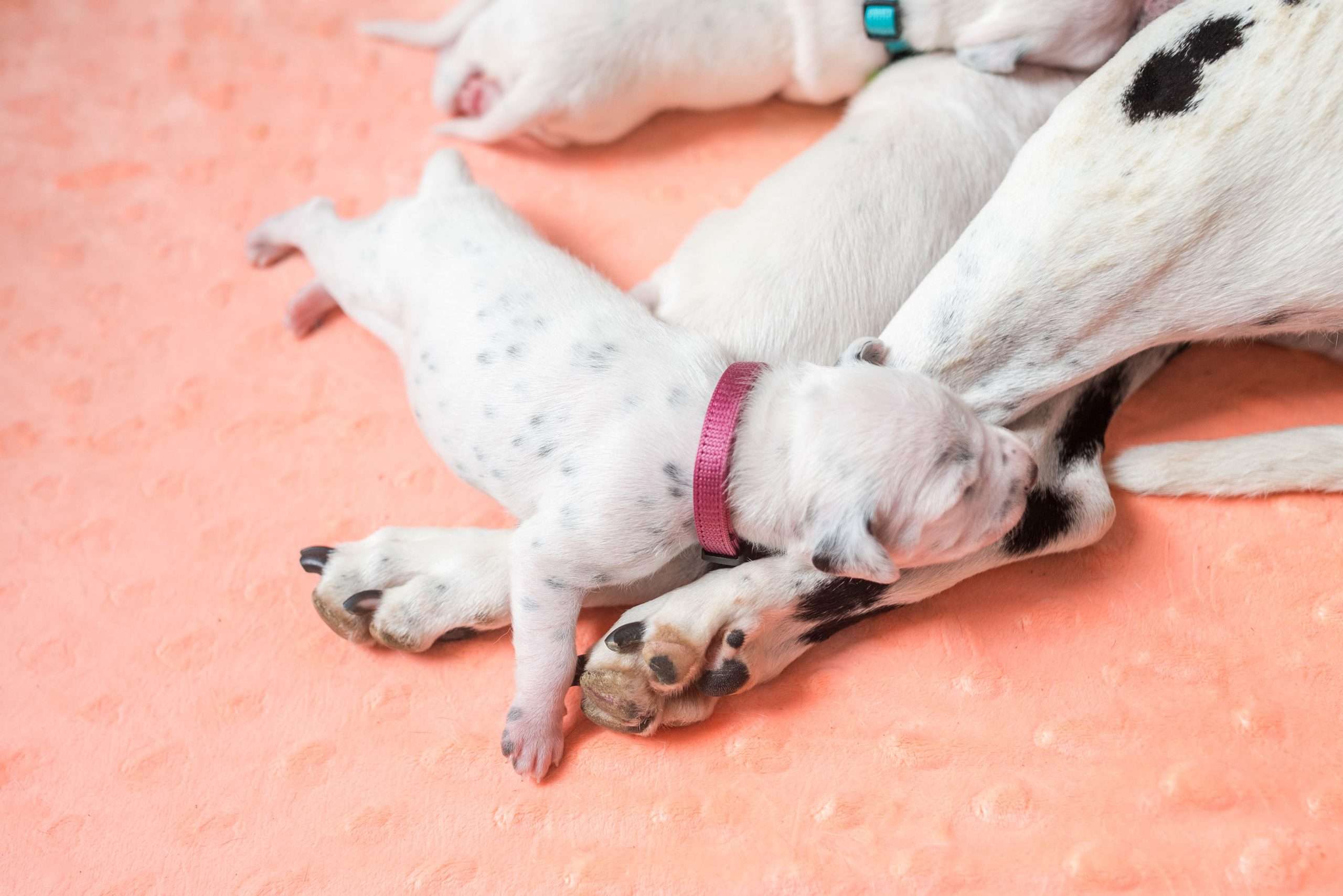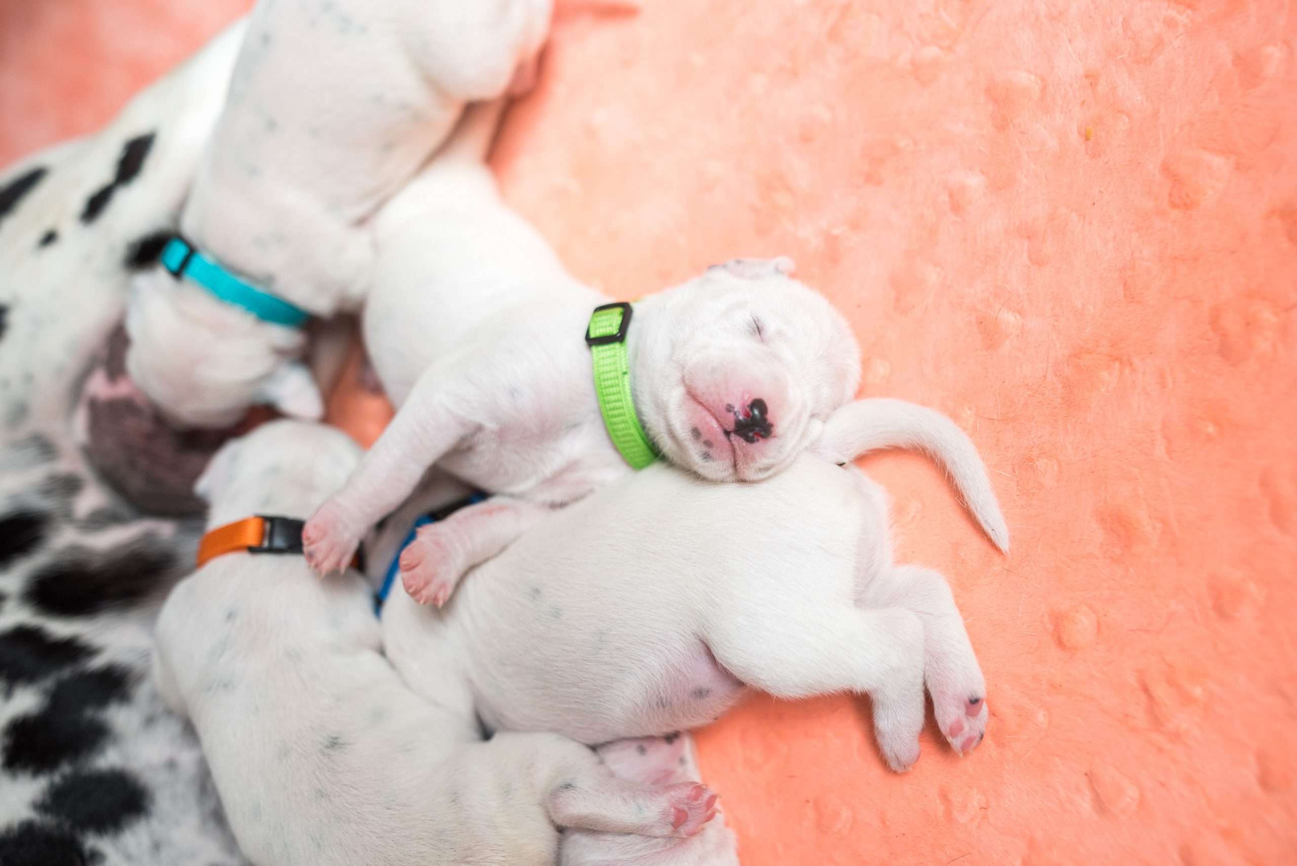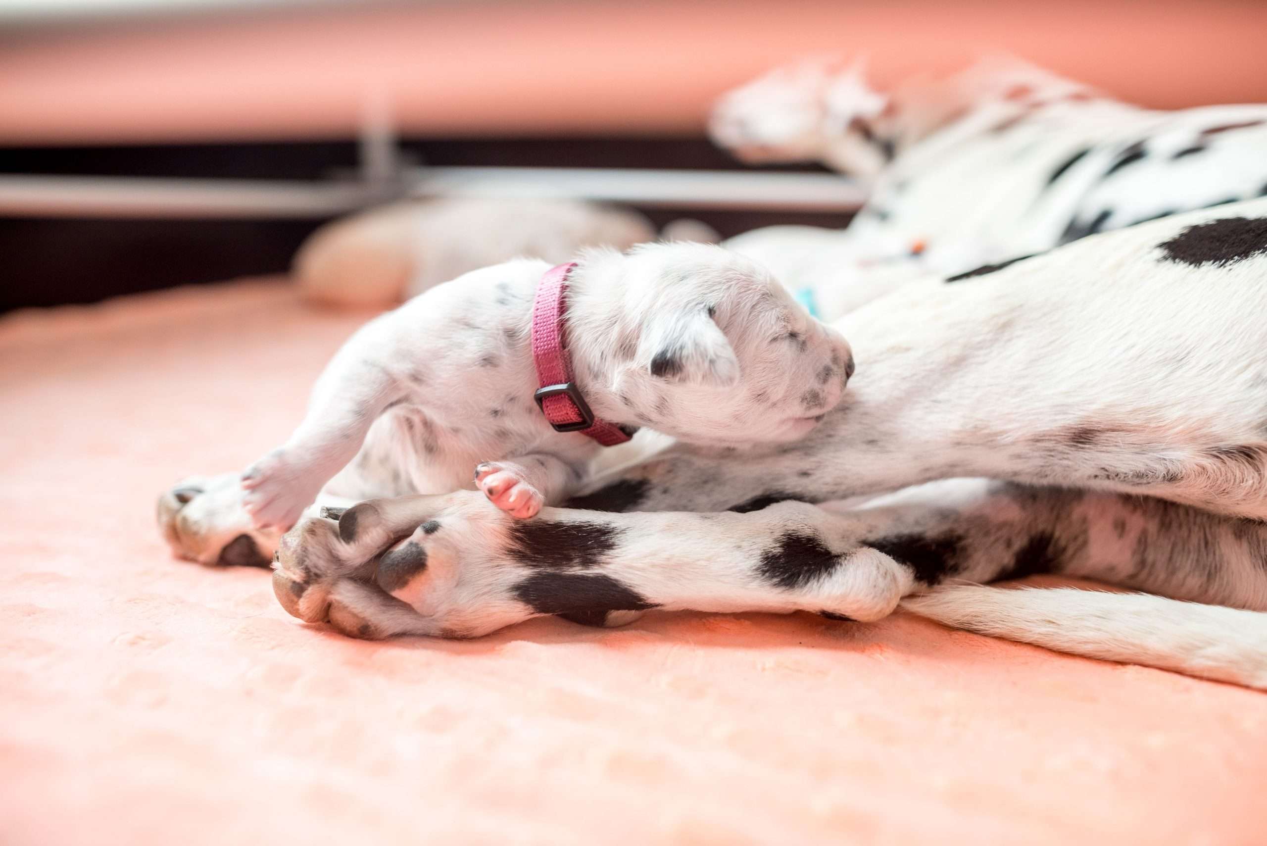 Hach, Welpe müsste man sein. Mit dickem Kugelbauch im Milchkoma satt und zufrieden schlummern. Es ist zuckersüß zu sehen, wie es in der ganzen Wurfbox zuckt und wackelt, hier mal ein Beinchen, da mal ein Öhrchen und ganz viel verträumtes Nuckeln. Und erst diese Geräusche dazu! Und diese kleinen heraushängenden Zungen. Zu goldig!