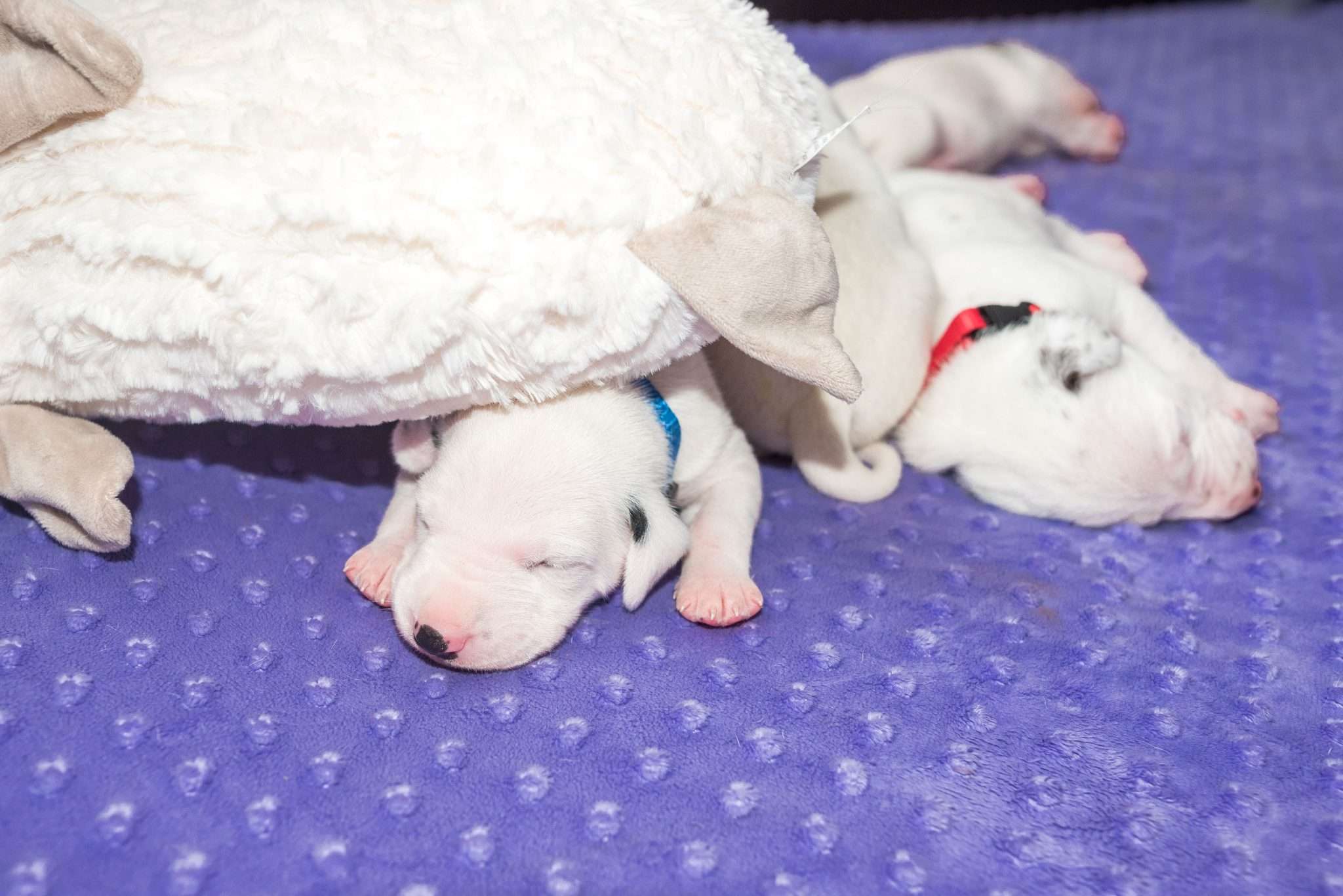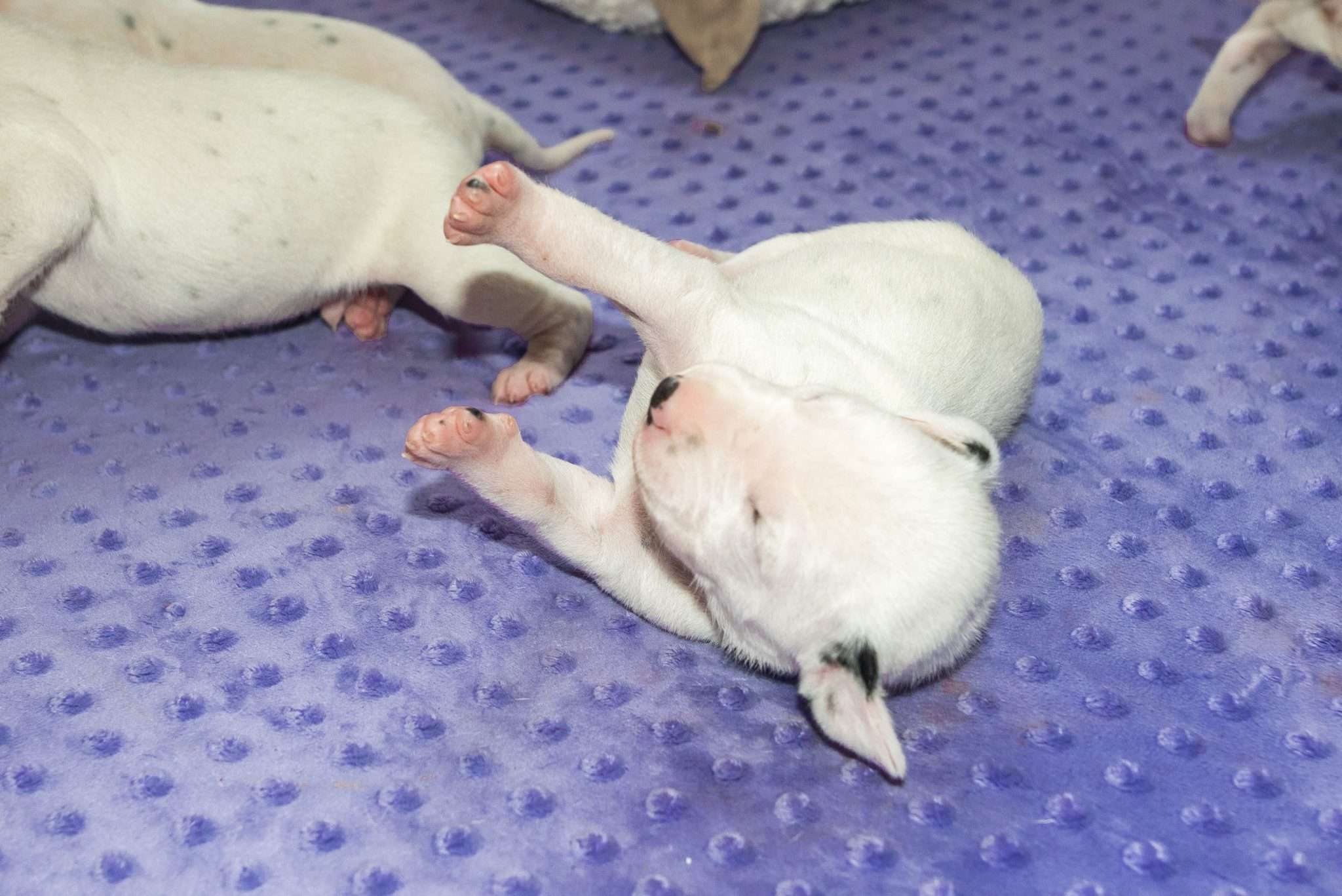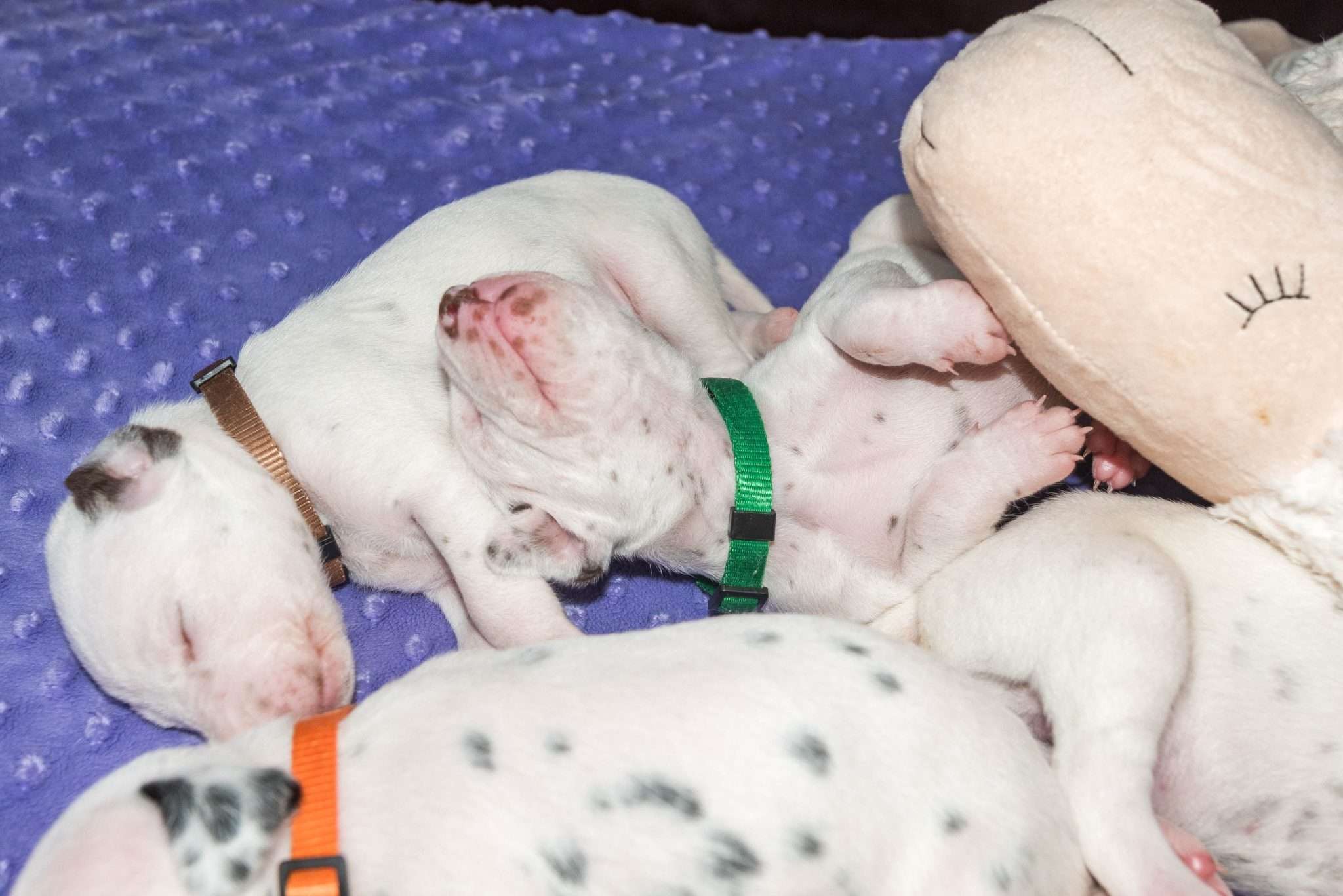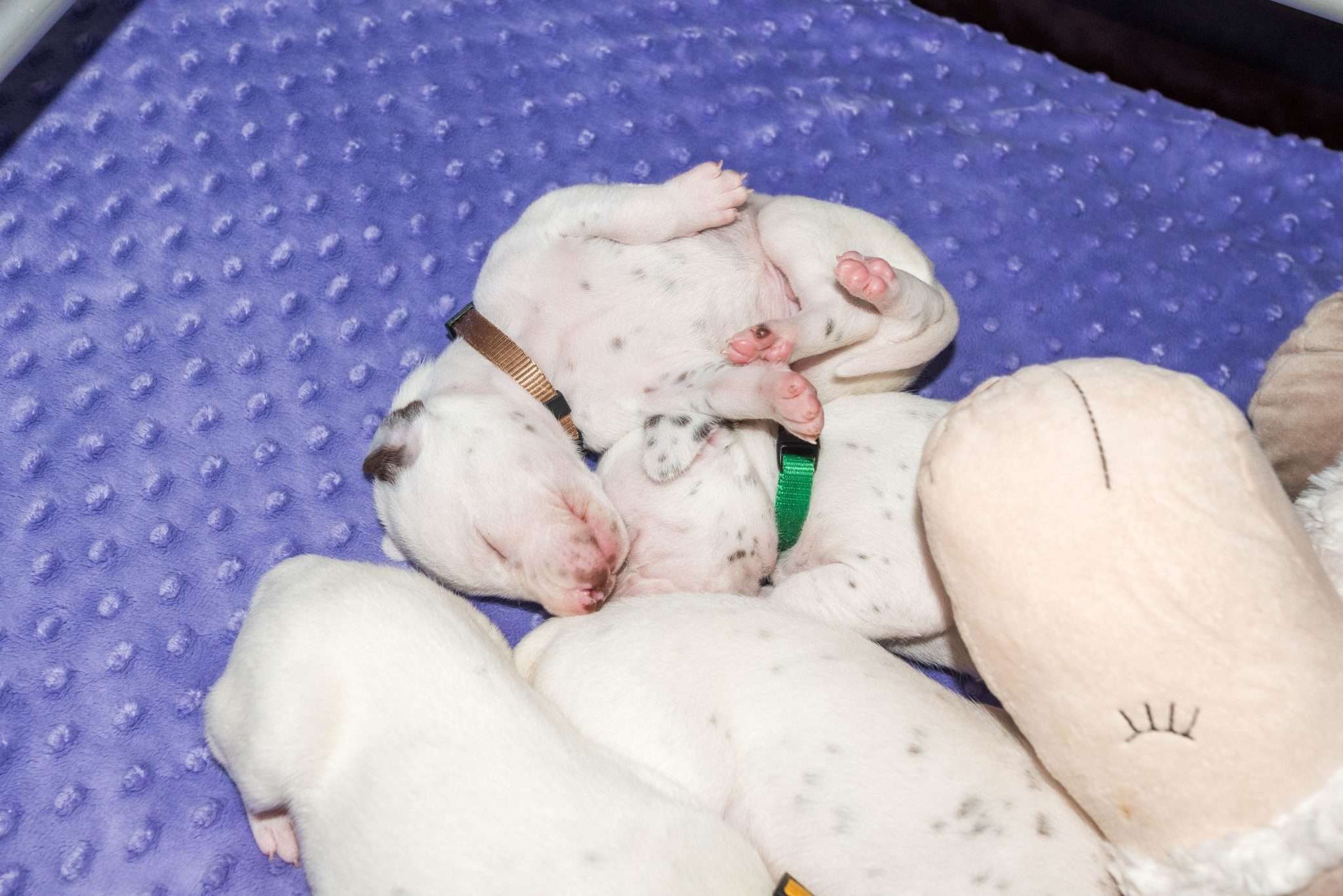 Wir starten mit ordentlich Gewusel in die neue Lebenswoche. Sind das wirklich die gleichen Welpen wie vor ein paar Tagen noch? Dieses Upgrade mit den Beinen hat eine gigantische Wirkung auf die Dynamik in der Schlummerkiste. Da ist nun ordentlich Leben in der Bude! Also in Maßen, genau genommen. Und nur manchmal. Aber wenn!! Besonders die schwarz getupften Buben fungieren als Initiatoren für erste Spieleinheiten untereinander, beknabbern andere am Ohr oder der Rute und mischen den Haufen ein bisschen auf. Es wird unterhaltsamer. Zumindest wenn man nicht kollektiv dem Milchkoma frönt. Auch unsere Nächte sind sehr ruhig, die Speckmaden hört man nur, wenn Dixi entscheidet, ihre Milch loswerden zu wollen.