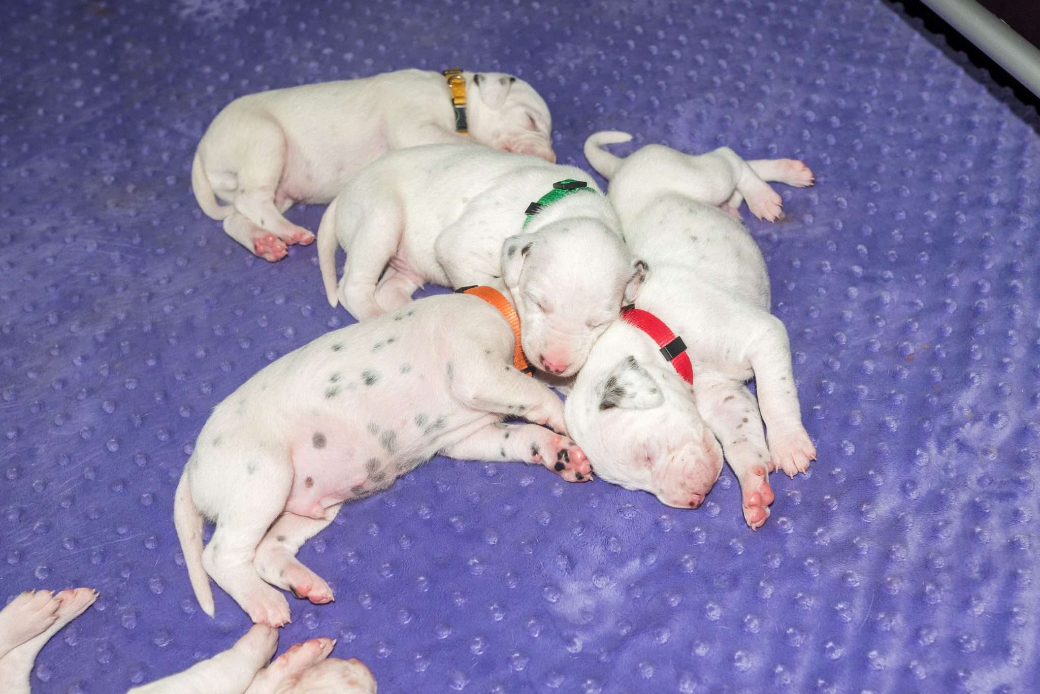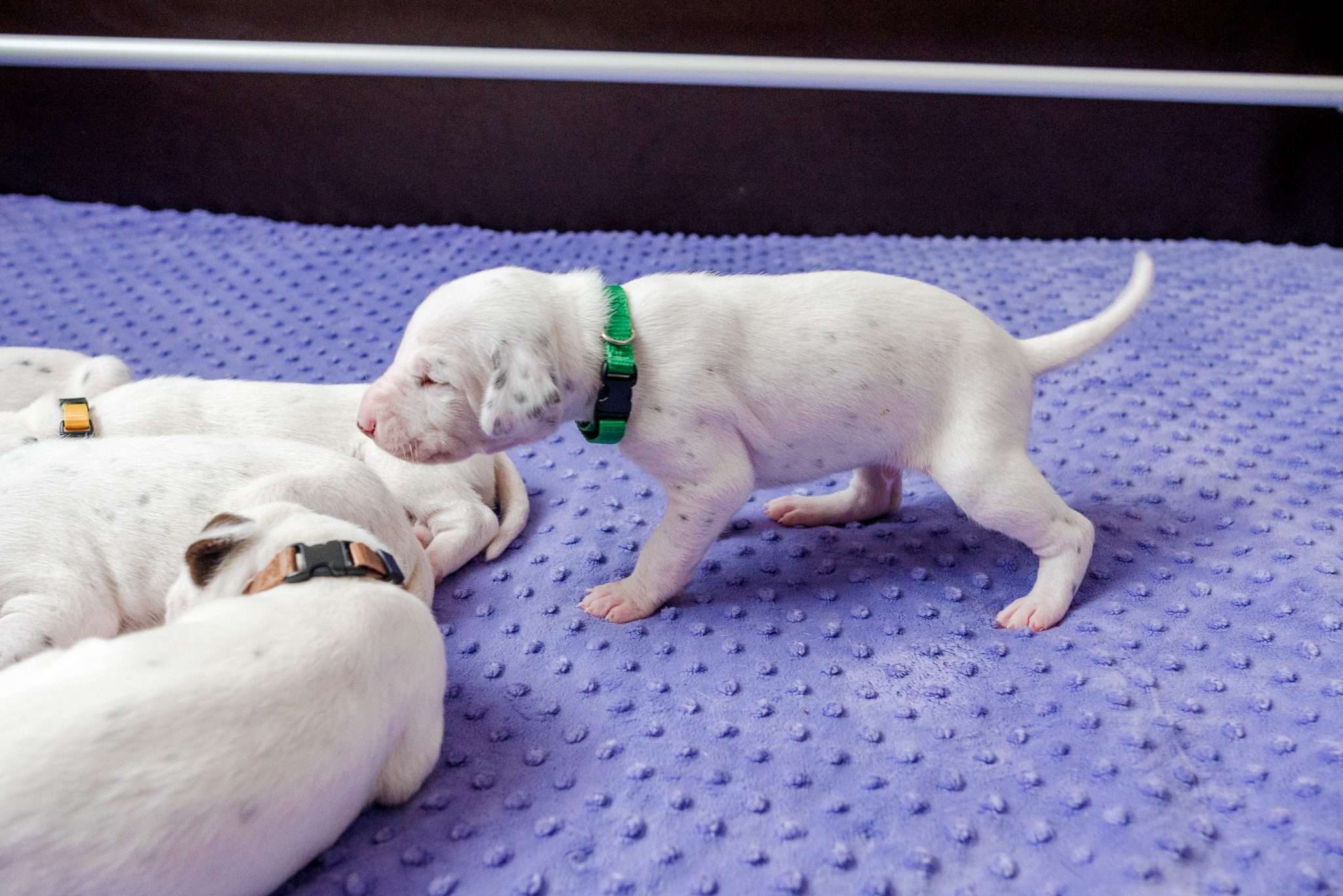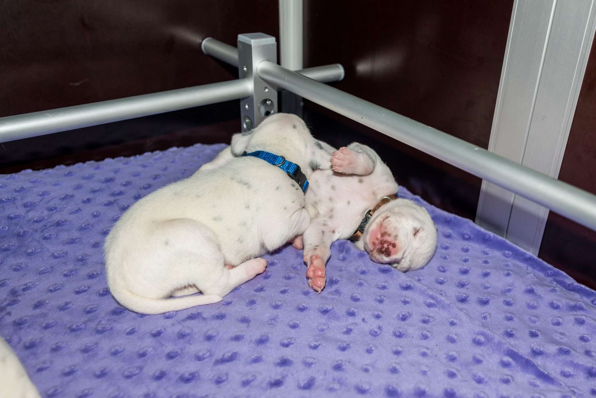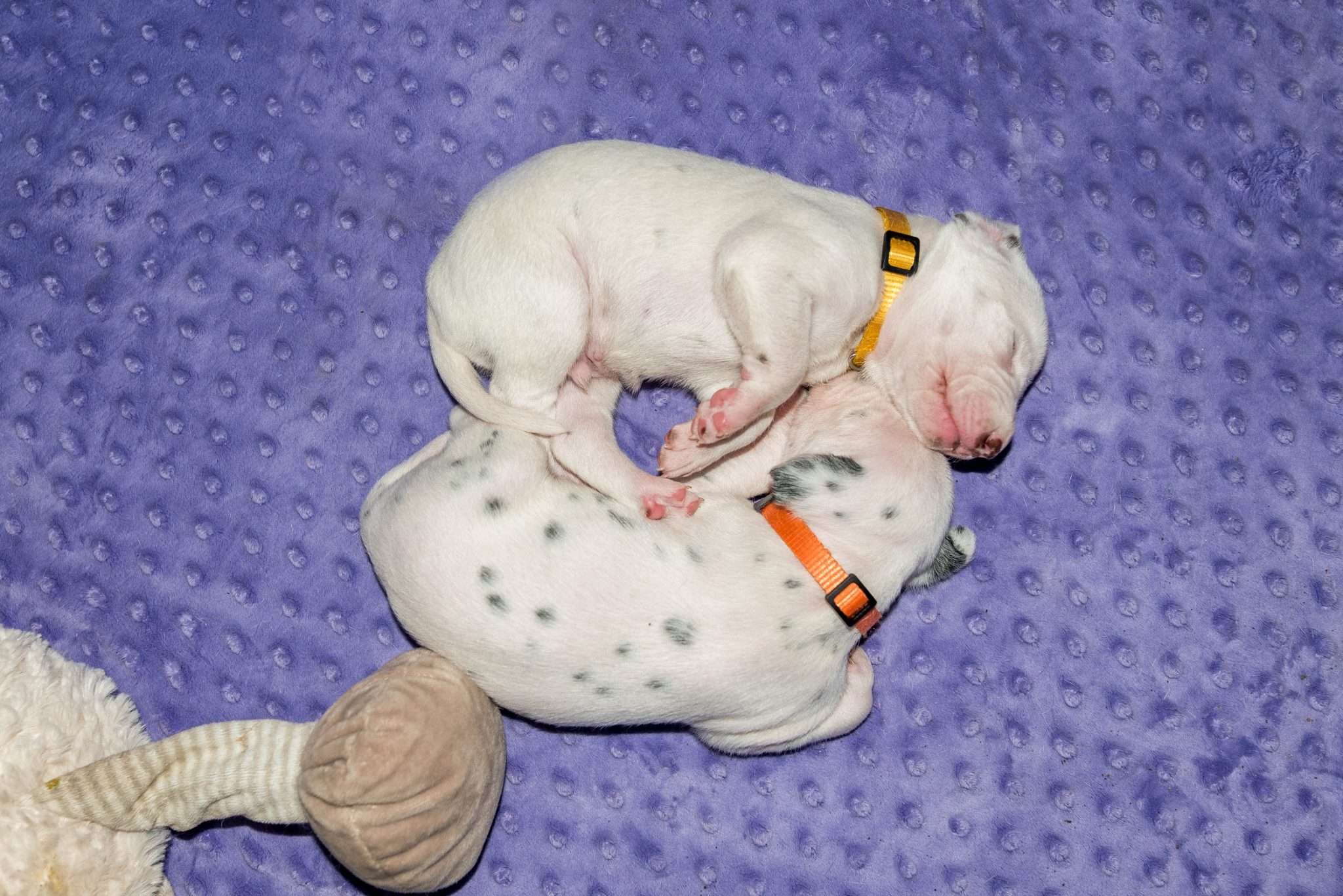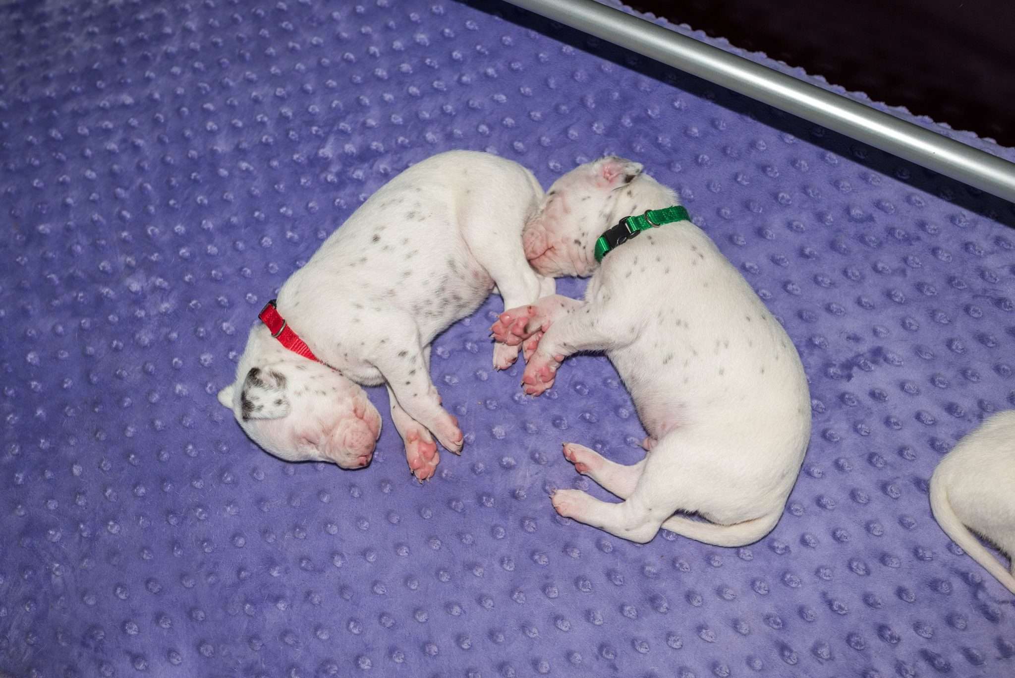 Wir starten mit ordentlich Gewusel in die neue Lebenswoche. Sind das wirklich die gleichen Welpen wie vor ein paar Tagen noch? Dieses Upgrade mit den Beinen hat eine gigantische Wirkung auf die Dynamik in der Schlummerkiste. Da ist nun ordentlich Leben in der Bude! Also in Maßen, genau genommen. Und nur manchmal. Aber wenn!! Besonders die schwarz getupften Buben fungieren als Initiatoren für erste Spieleinheiten untereinander, beknabbern andere am Ohr oder der Rute und mischen den Haufen ein bisschen auf. Es wird unterhaltsamer. Zumindest wenn man nicht kollektiv dem Milchkoma frönt. Auch unsere Nächte sind sehr ruhig, die Speckmaden hört man nur, wenn Dixi entscheidet, ihre Milch loswerden zu wollen.