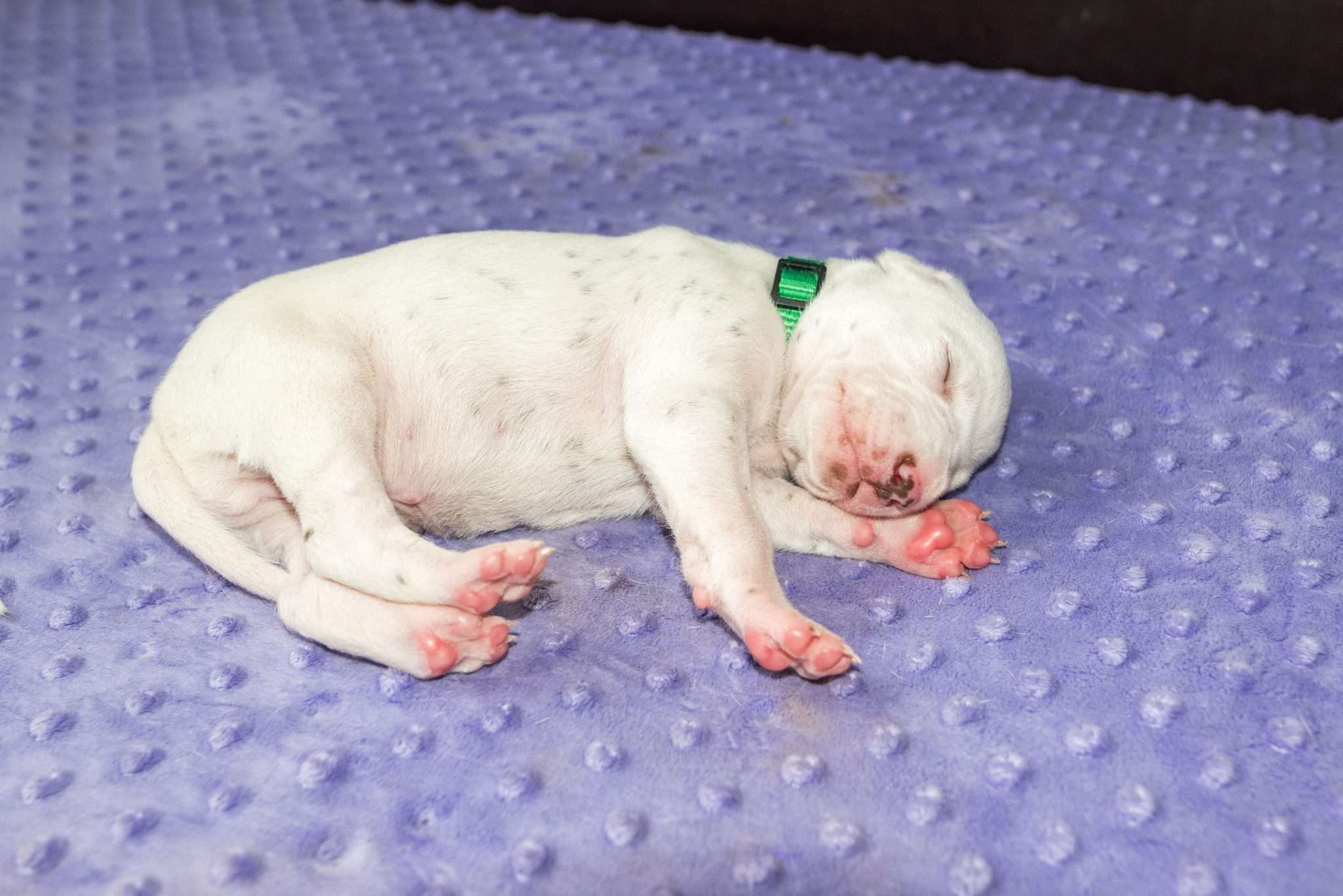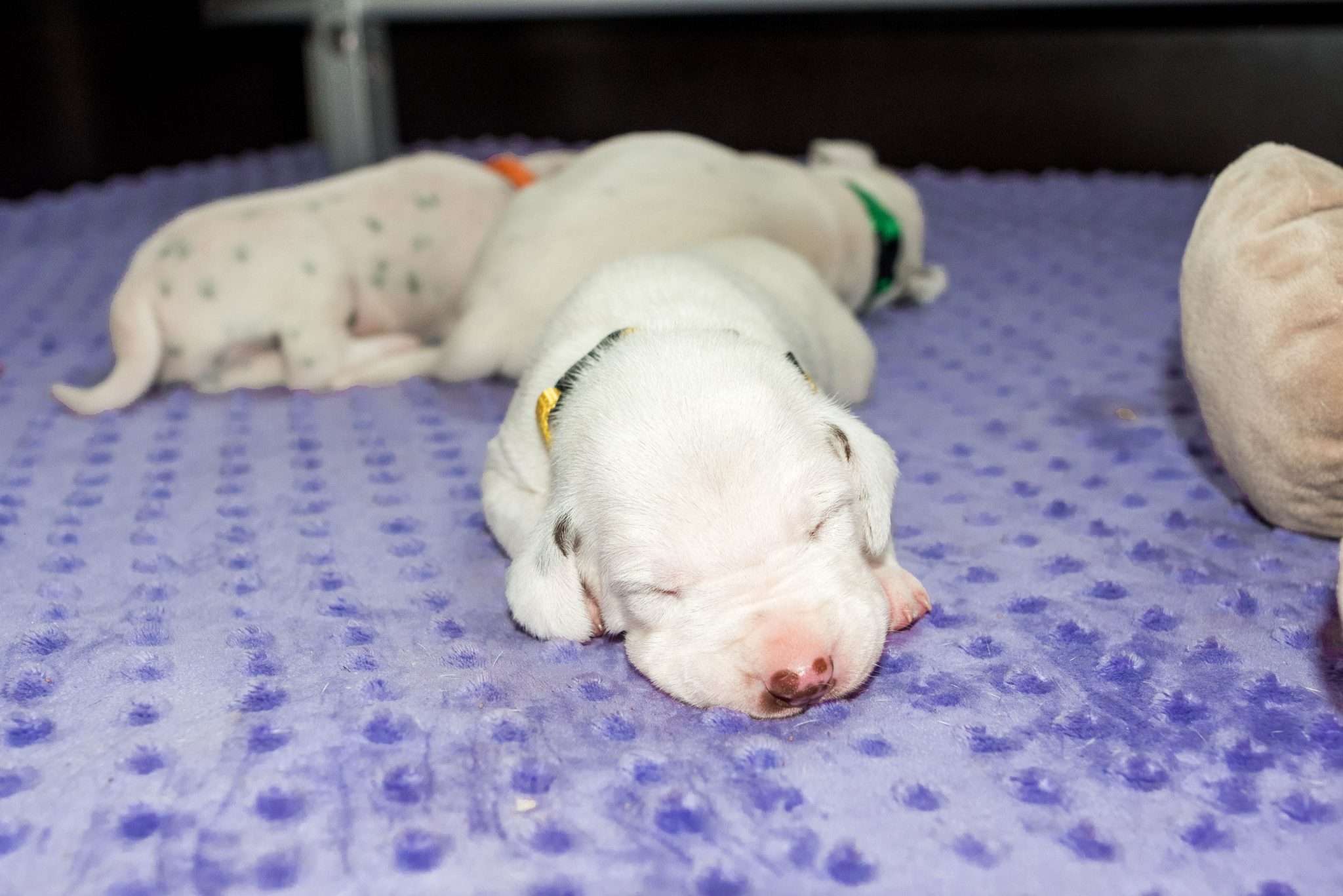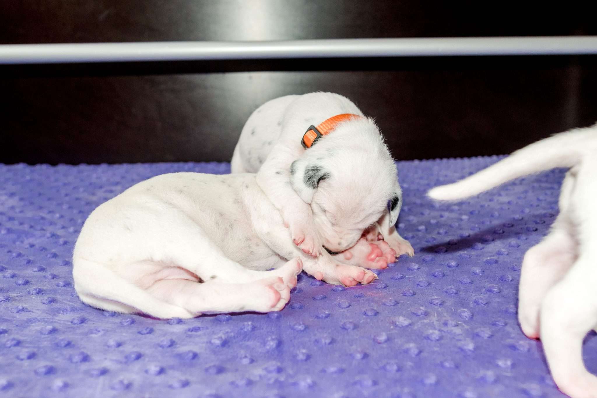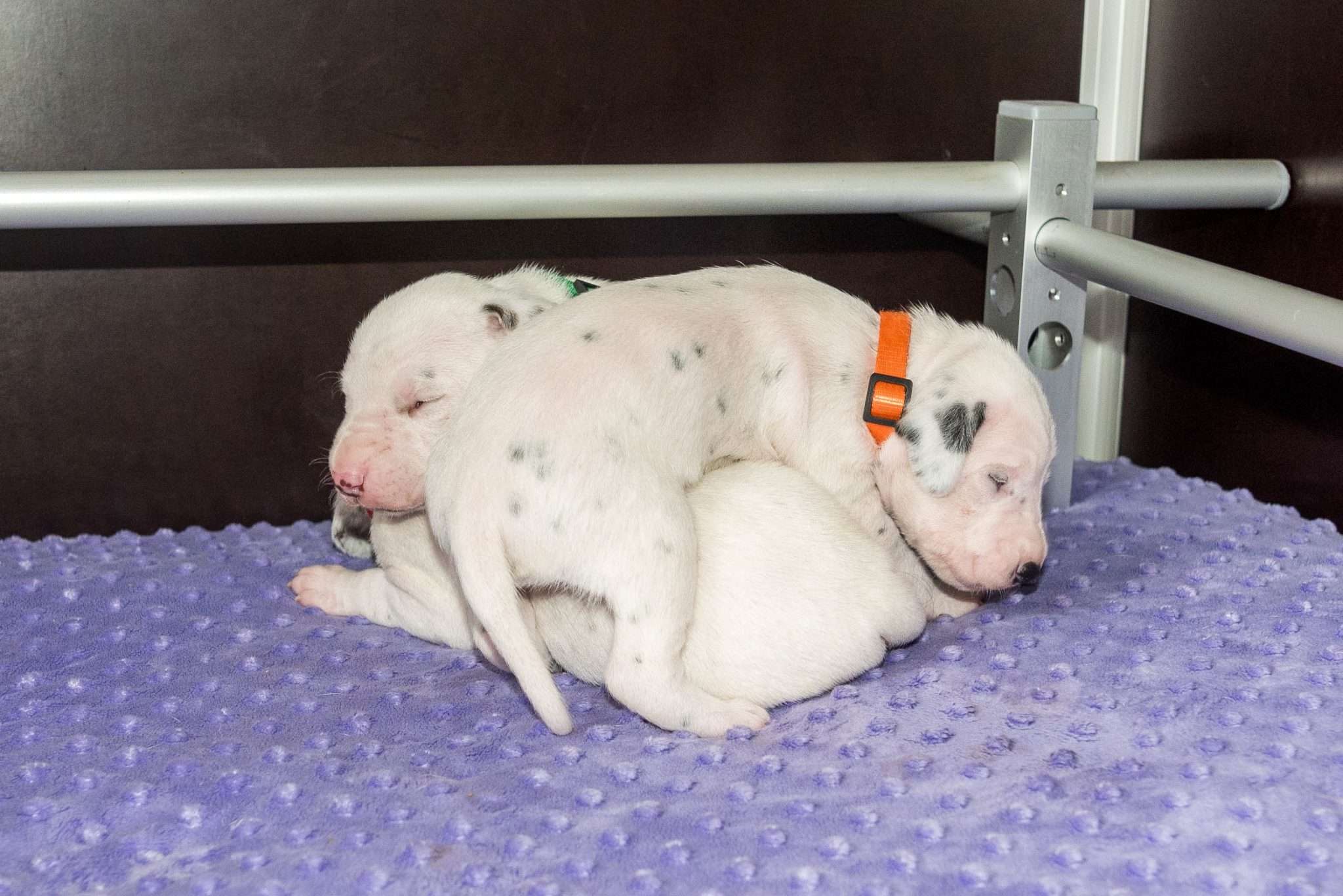 Wir starten mit ordentlich Gewusel in die neue Lebenswoche. Sind das wirklich die gleichen Welpen wie vor ein paar Tagen noch? Dieses Upgrade mit den Beinen hat eine gigantische Wirkung auf die Dynamik in der Schlummerkiste. Da ist nun ordentlich Leben in der Bude! Also in Maßen, genau genommen. Und nur manchmal. Aber wenn!! Besonders die schwarz getupften Buben fungieren als Initiatoren für erste Spieleinheiten untereinander, beknabbern andere am Ohr oder der Rute und mischen den Haufen ein bisschen auf. Es wird unterhaltsamer. Zumindest wenn man nicht kollektiv dem Milchkoma frönt. Auch unsere Nächte sind sehr ruhig, die Speckmaden hört man nur, wenn Dixi entscheidet, ihre Milch loswerden zu wollen.