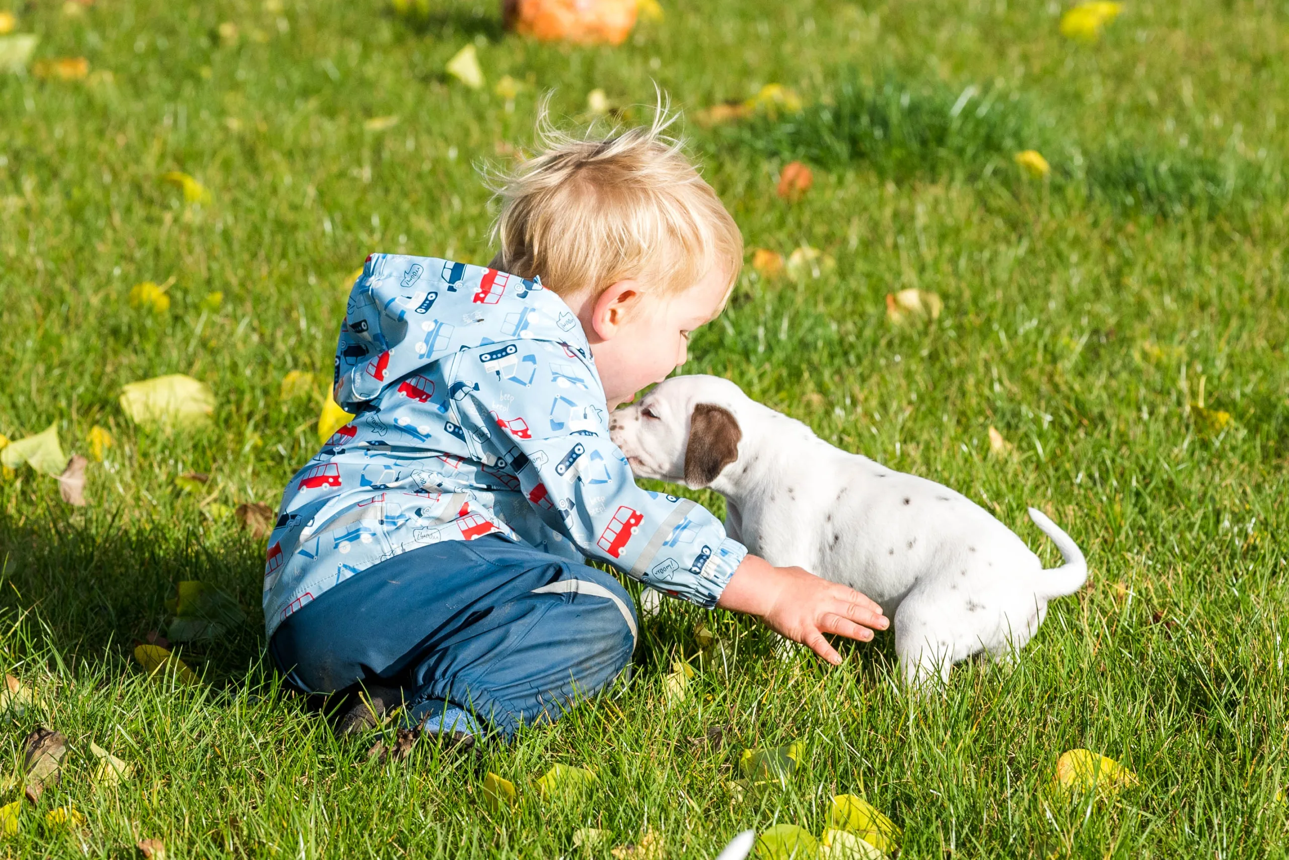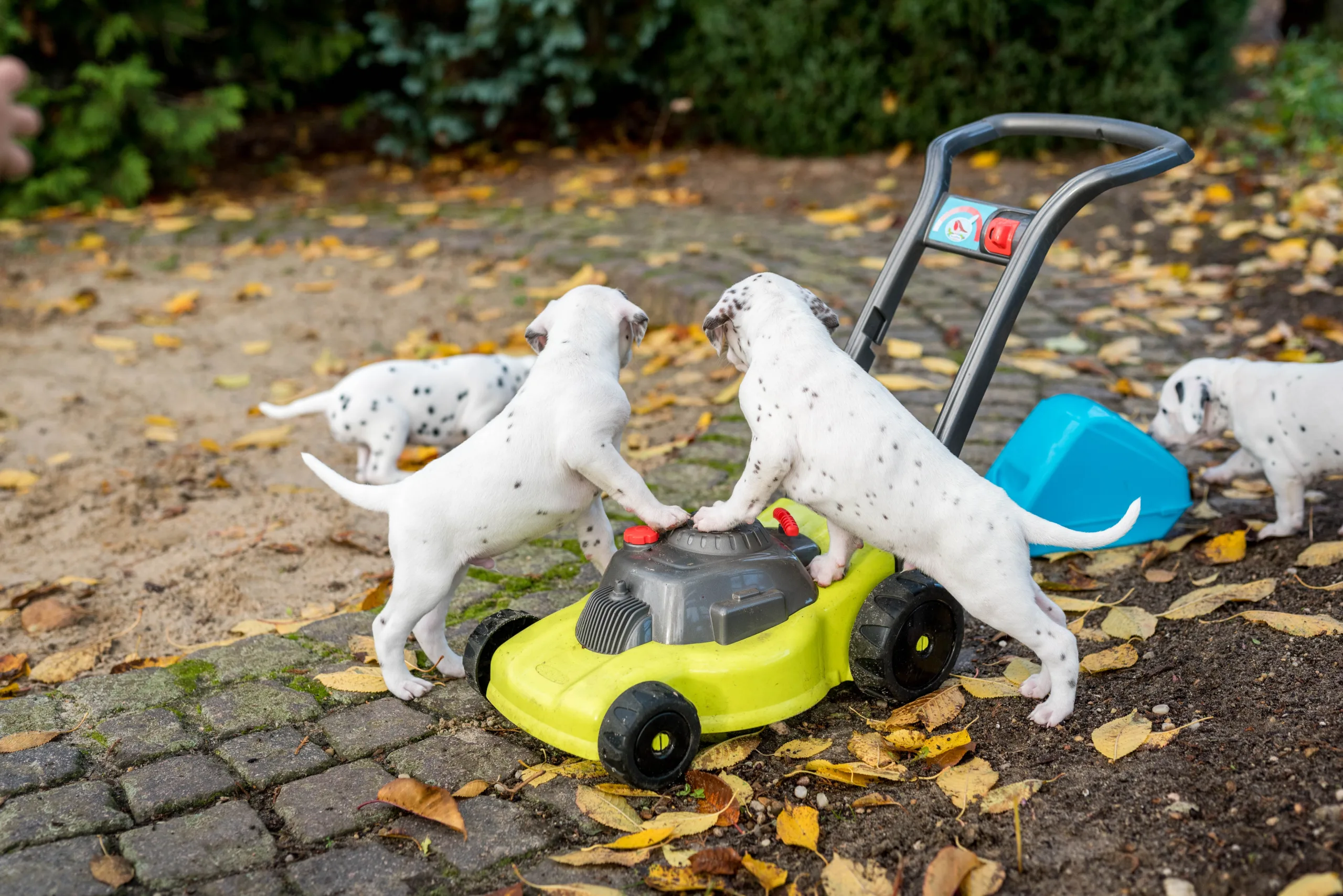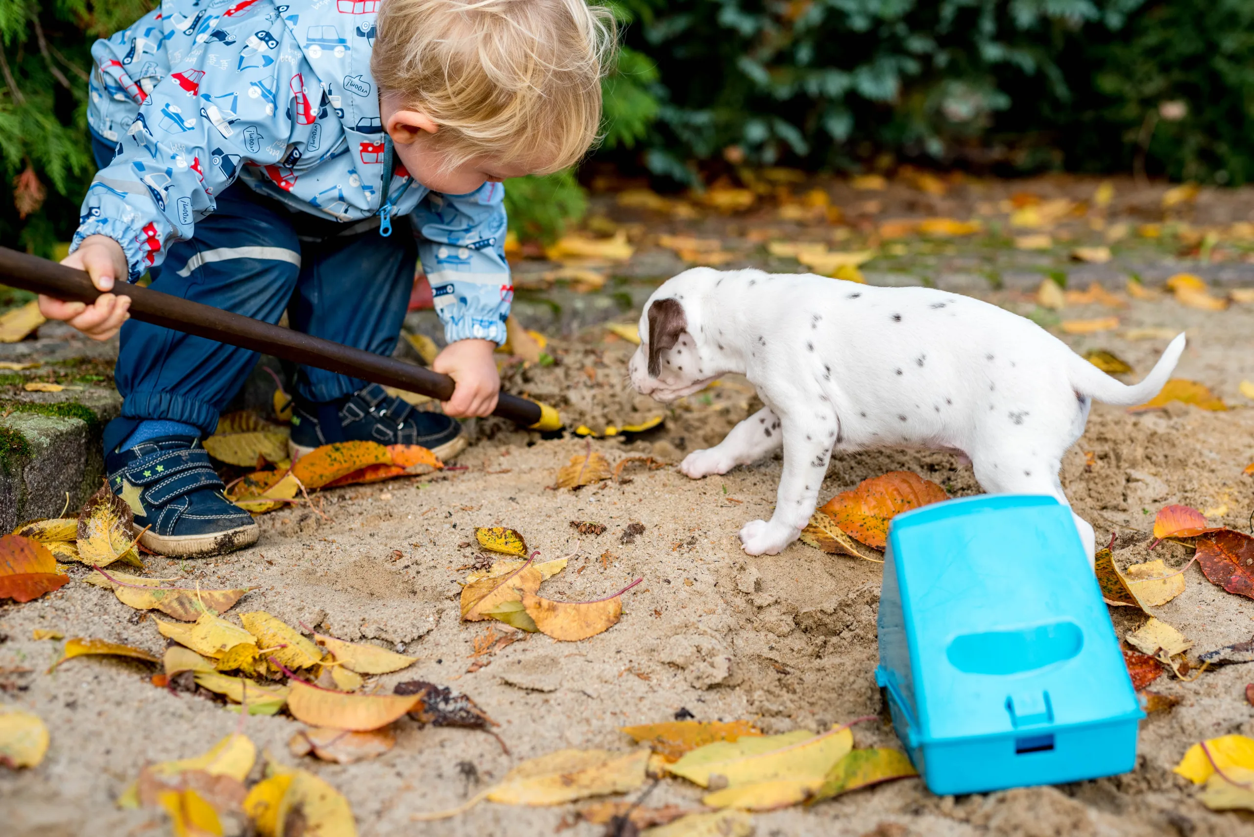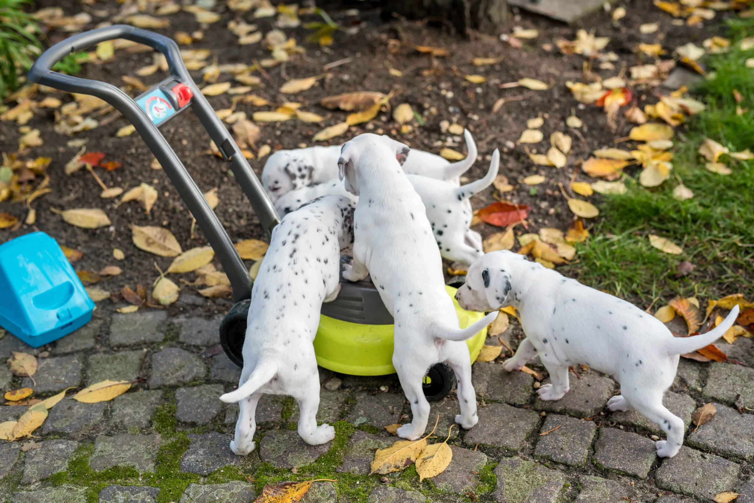 Vormittags ging es in den Sandkasten, auf dem ich extra die Blätter noch habe etwas länger liegen lassen, die dann von einigen ganz stolz herumgetragen wurden. Ringsherum lockten neue Gerüche von den angrenzenden Beeten, unterschiedliche Strukturen unter den Pfötchen und alle konnten ein bisschen gärtnern. Besonders Herr Braun hatte daran seine helle Freude. Laubrechen und Rollator wurden von den Herren Orange und Rot inspiziert, das Tannenwäldchen von Herrn Grün erforscht, während Herr Blau durch den Blätterhaufen hüpfte und Herr Gelb den Rasenmäher kontrollierte. Ausnahmslos alle waren super neugierig, aufgeschlossen und offen für alle neuen Eindrücke. Zu sehen, wie sie immer mutiger, frecher, selbstbewusster und eigenständiger werden, ist ein unbeschreibliches Gefühl.
