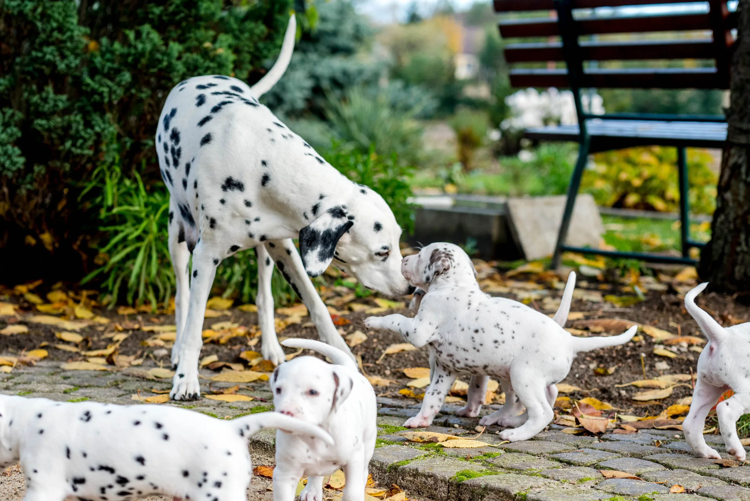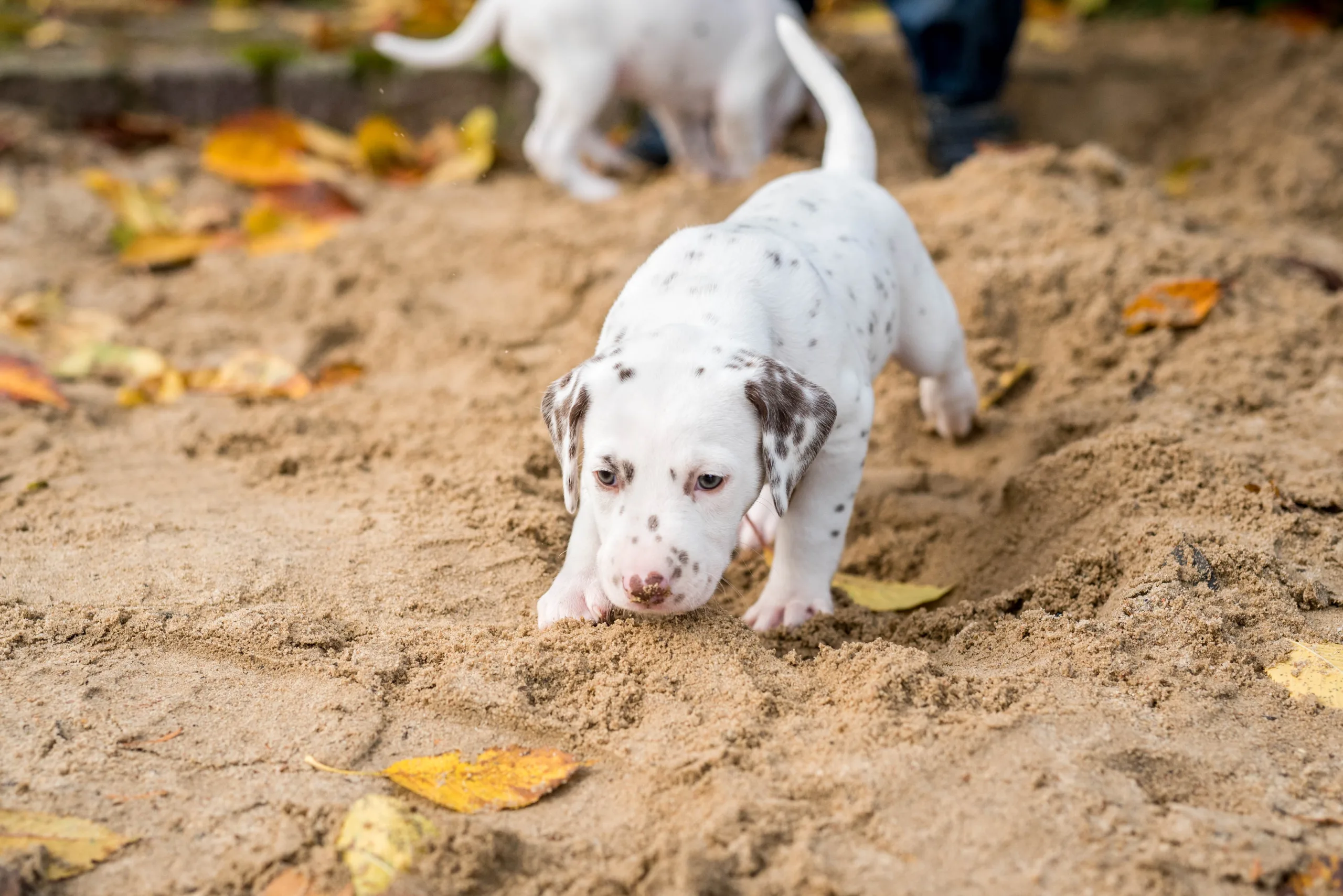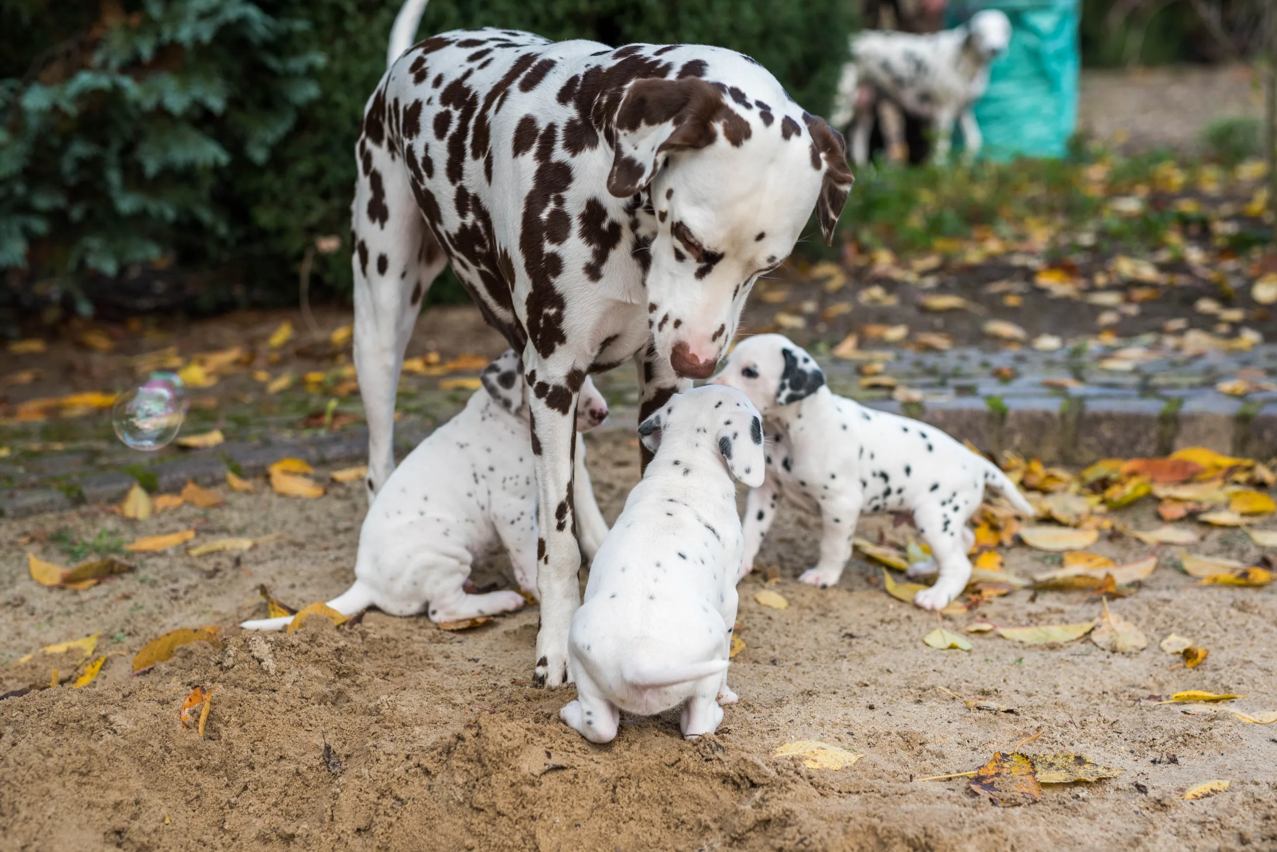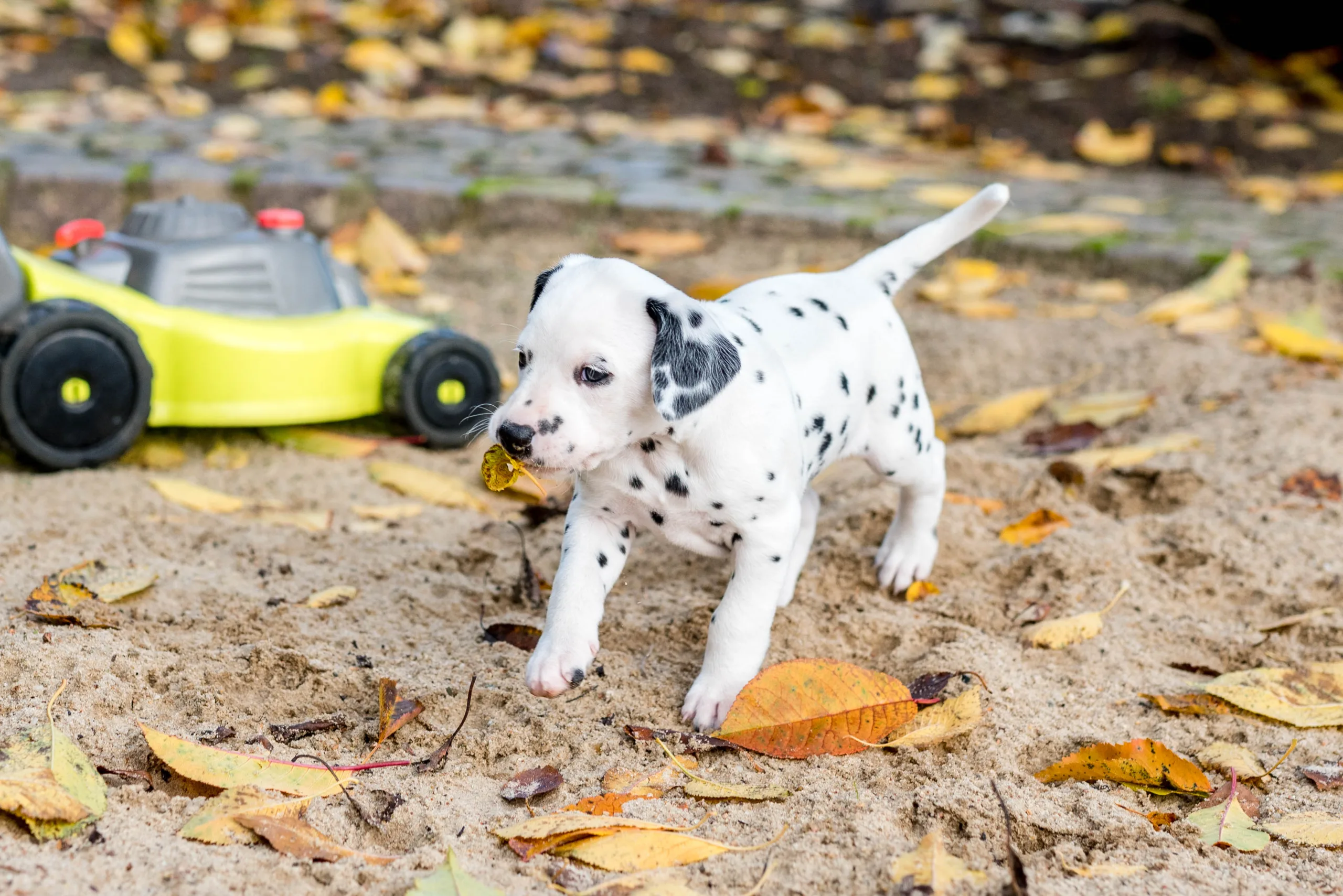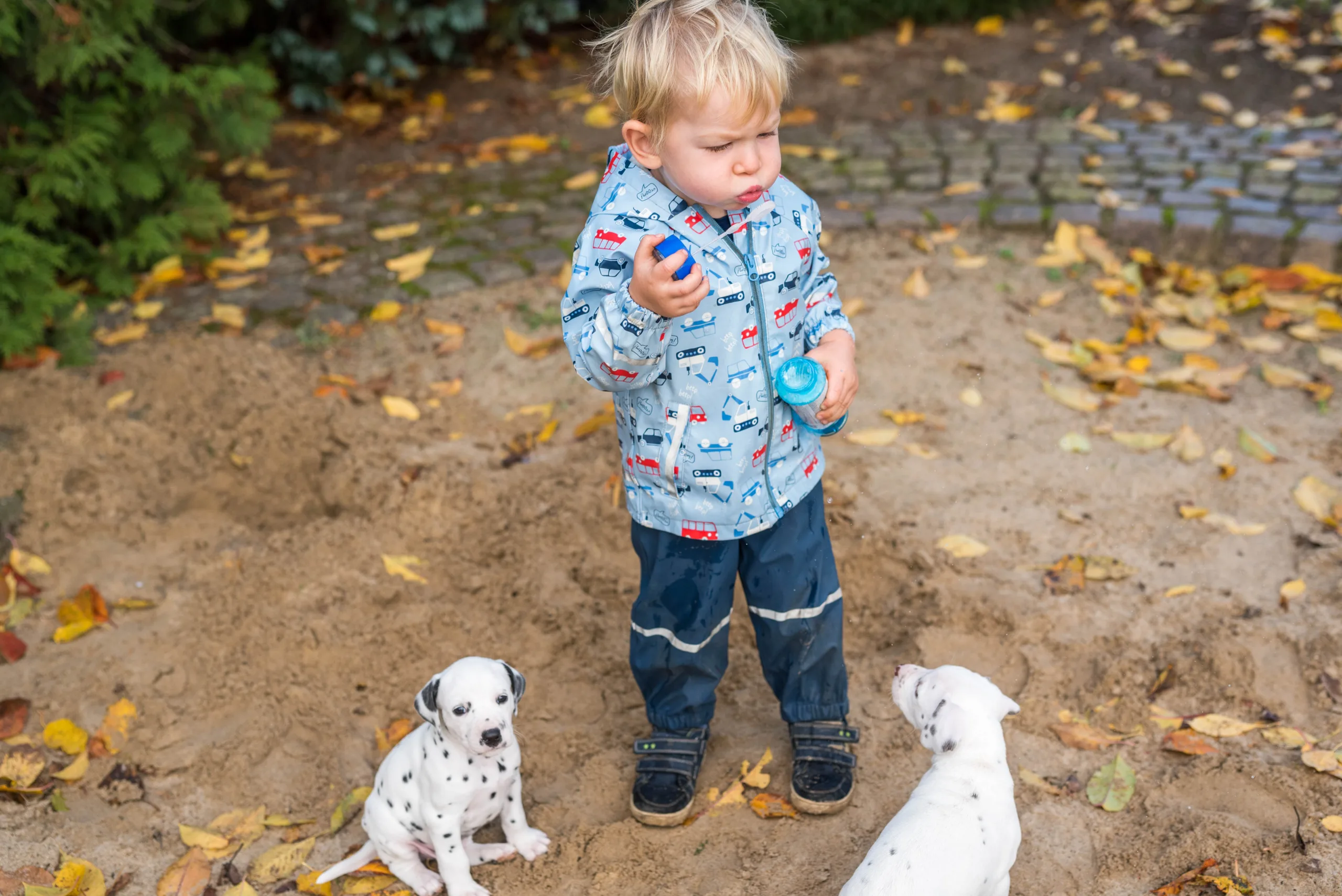 Vormittags ging es in den Sandkasten, auf dem ich extra die Blätter noch habe etwas länger liegen lassen, die dann von einigen ganz stolz herumgetragen wurden. Ringsherum lockten neue Gerüche von den angrenzenden Beeten, unterschiedliche Strukturen unter den Pfötchen und alle konnten ein bisschen gärtnern. Besonders Herr Braun hatte daran seine helle Freude. Laubrechen und Rollator wurden von den Herren Orange und Rot inspiziert, das Tannenwäldchen von Herrn Grün erforscht, während Herr Blau durch den Blätterhaufen hüpfte und Herr Gelb den Rasenmäher kontrollierte. Ausnahmslos alle waren super neugierig, aufgeschlossen und offen für alle neuen Eindrücke. Zu sehen, wie sie immer mutiger, frecher, selbstbewusster und eigenständiger werden, ist ein unbeschreibliches Gefühl.