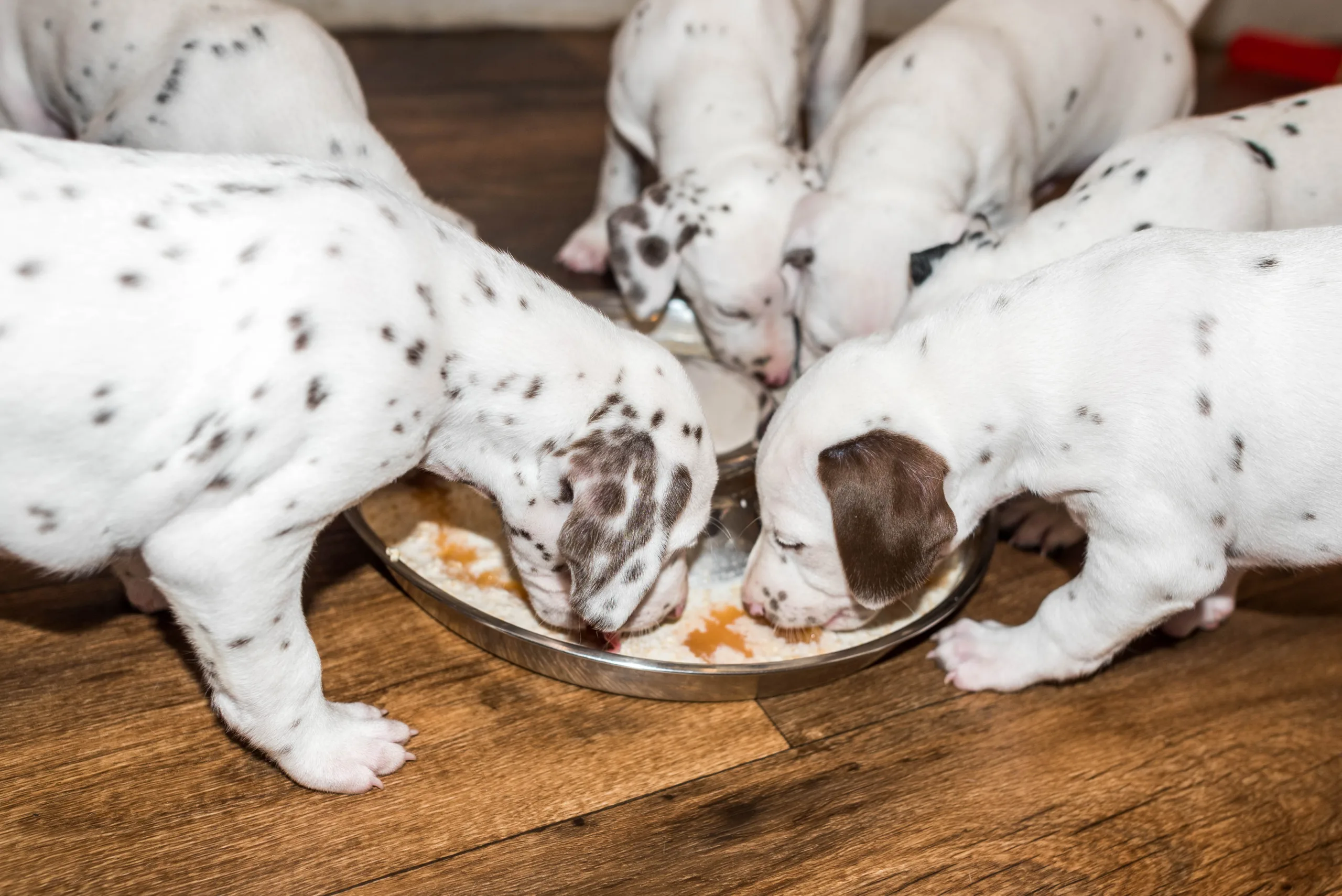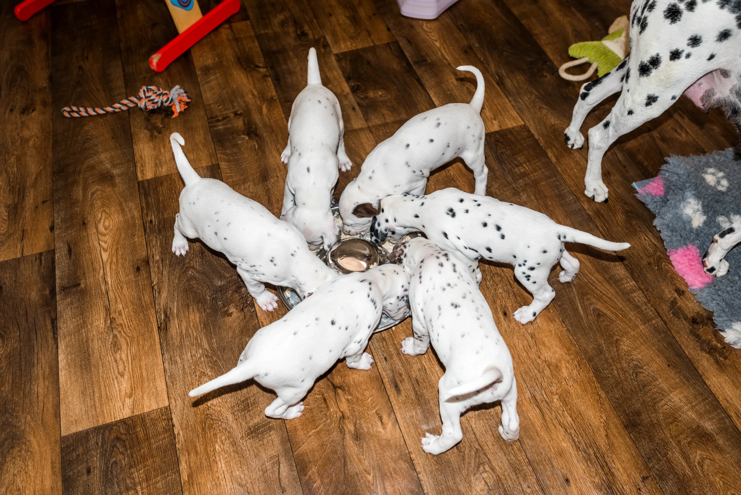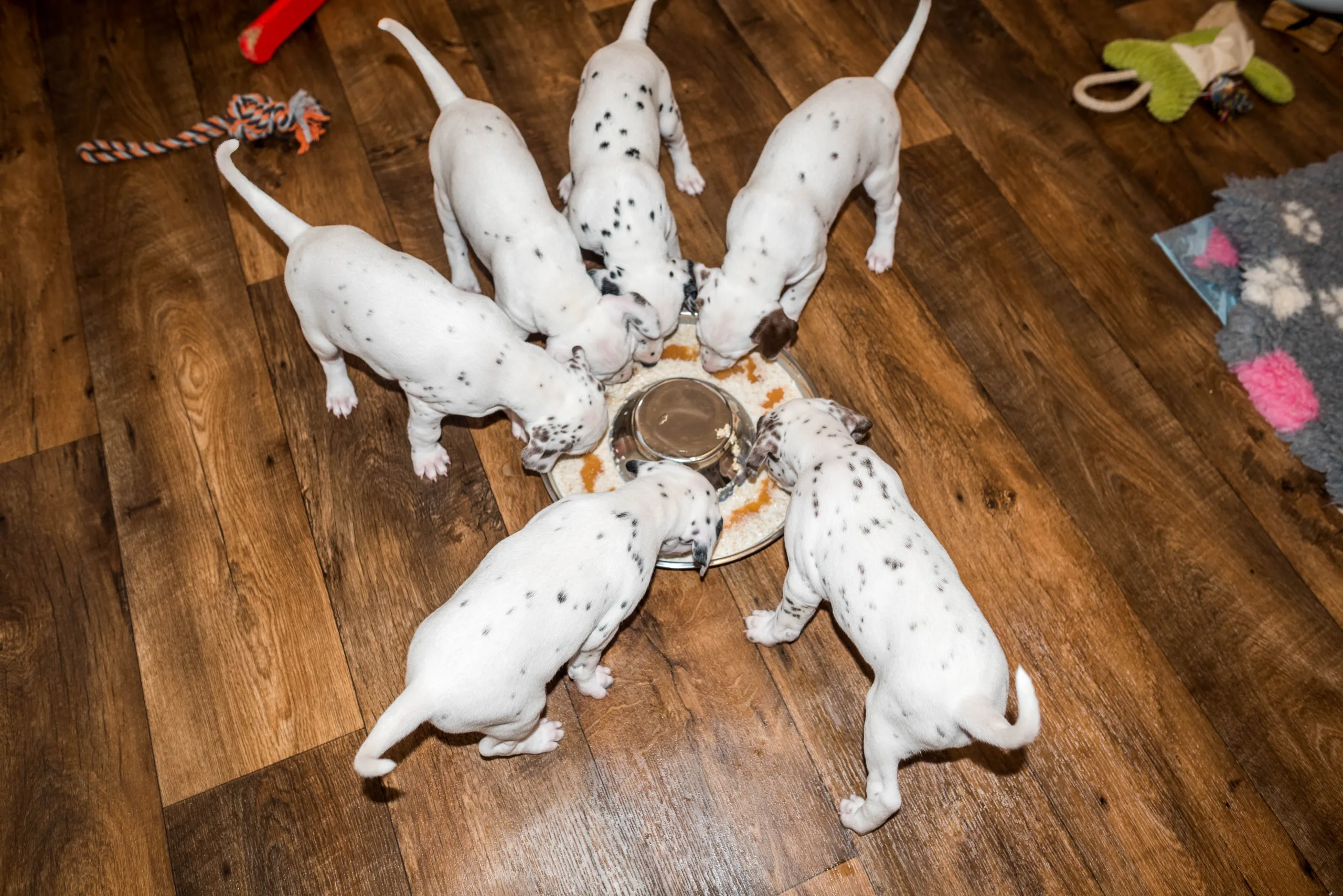 Genießer haben wir nicht dabei, allesamt Marke Gierschlund und damit haben alle die gleichen Chancen. Anders als noch vor wenigen Wochen beim natürlichen Kampf um die begehrtesten Zitzen, wird am Napf erstaunlich brüderlich geteilt. Jeder sucht sich seinen Platz und insgesamt läuft das ziemlich manierlich ab, sodass nach wie vor alle gemeinsam speisen können. Wäre jemand dabei, der in der Rangelei zu kurz käme oder aber arg über die Stränge schlägt, sodass es sich allabendlich auf der Waage zeigt, würde ich separiert füttern und diejenigen bekämen eine individuelle Portion Gute-Nacht-Brei, würden eher oder später als die anderen an den Napf gelassen werden. Es soll weder aggressiver Futterneid noch die Notwendigkeit zur Ressourcenverteidigung entstehen, keiner muss sich mehr gegen die anderen durchsetzen und jeder bekommt, was er braucht. Wichtig ist mir auch nach wie vor, dass mir die Speckies im wahrsten Sinne aus der Hand fressen. Dabei geht es mir nicht um die Bindung, die erhalten Hunde bekanntlich mehr dadurch, dass sie in der Bezugsperson einen verlässlichen, konsequenten und verständlichen Sozialpartner vorfinden. Mir geht es eher darum, die menschliche Hand weiterhin positiv zu verknüpfen.