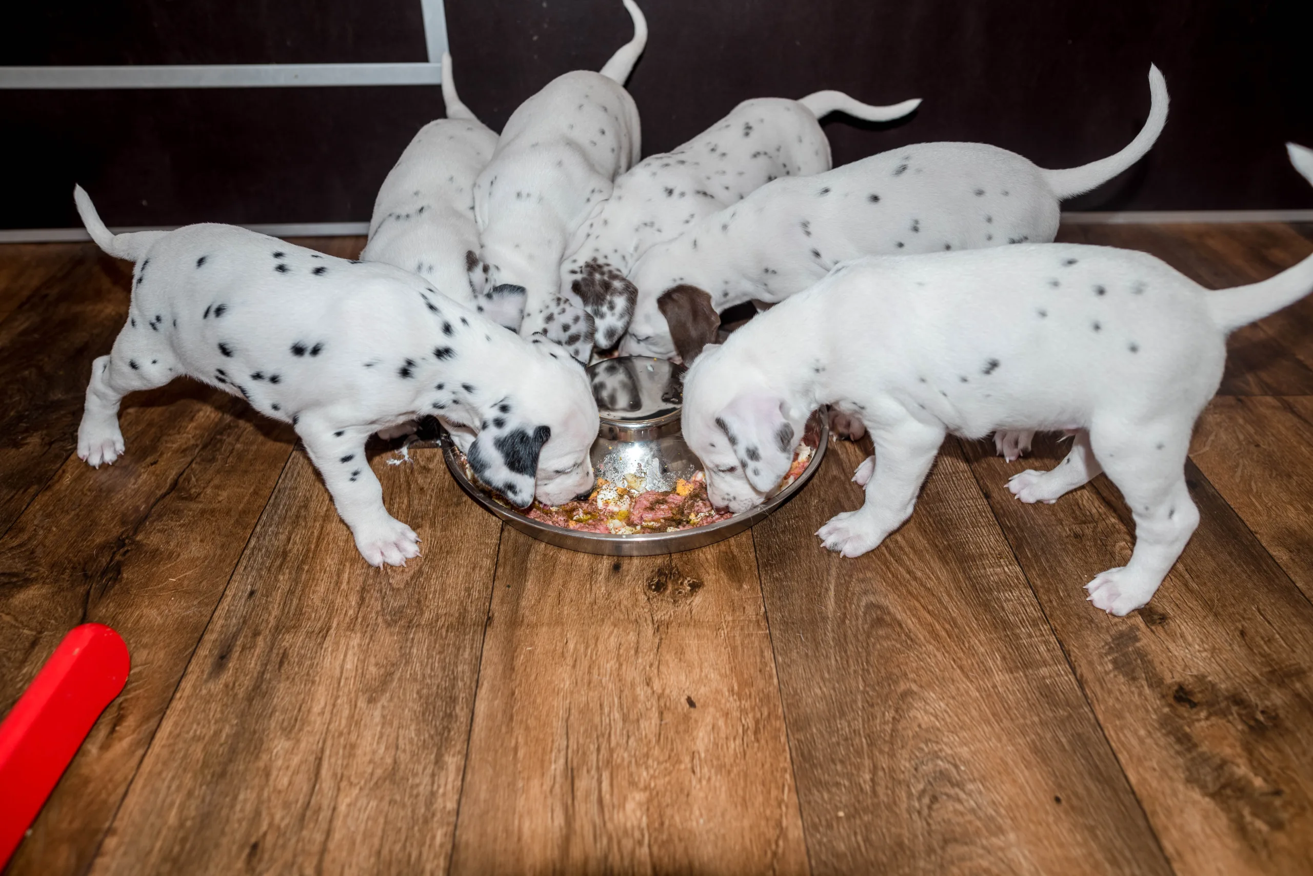 Mittlerweile sind die Feinschmecker mit Ziegenmilch, Haferflocken, Hühnchen, Pute und Rindfleisch bestens vertraut. Auch Öl, Pansen/Blättermagen, kleine Mengen Innereien und gewolfte Hälse gehören zum festen Speiseplan der Leckermäuler. Alles noch ziemlich breiig, aber da die fiesen kleinen Zähnchen schon ordentlich zwicken können, steigen die Fressblagen demnächst in die Liga der stückigen Konsistenz auf, für die Zahnpflege und den Kauspaß soll ja schließlich auch gesorgt werden.