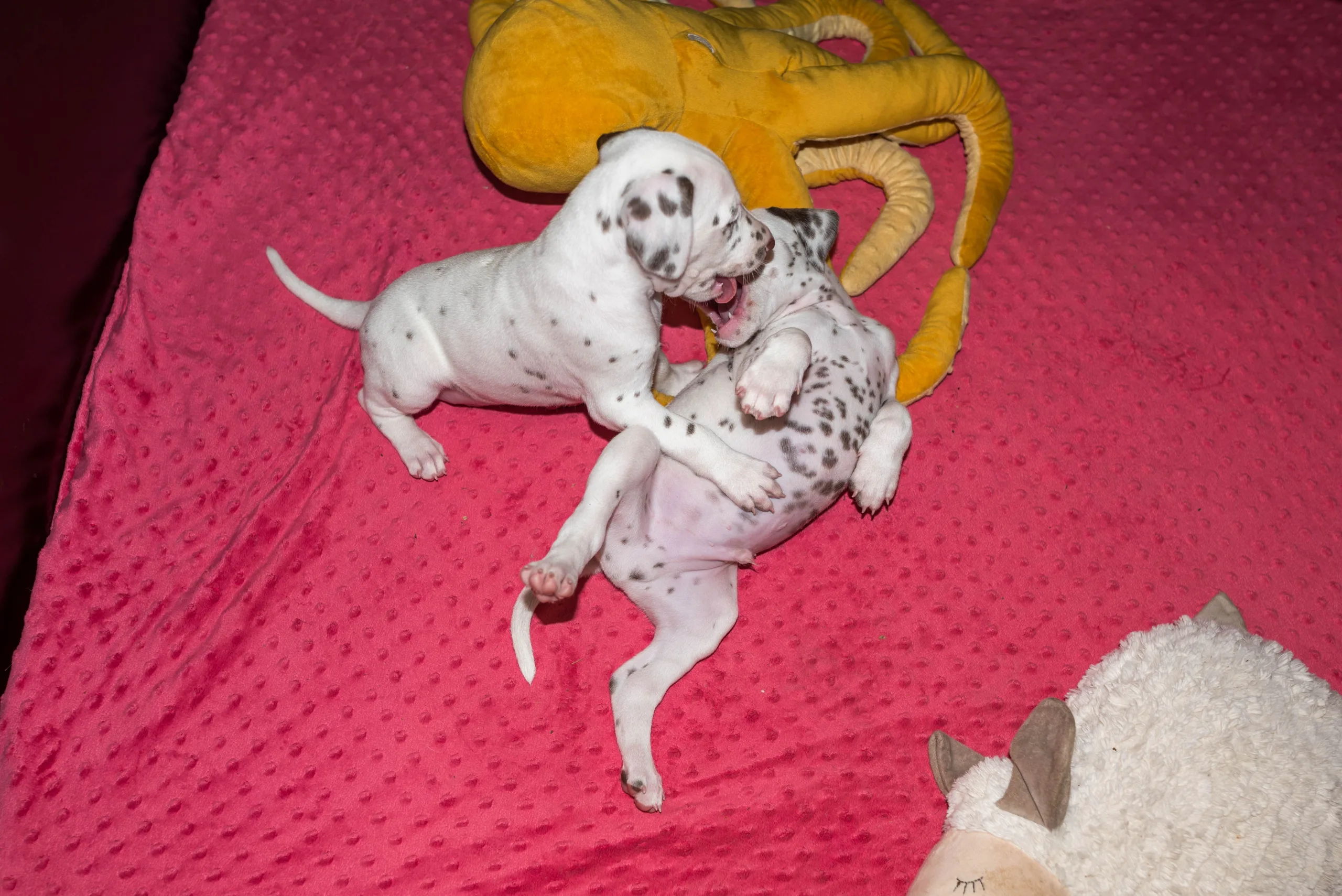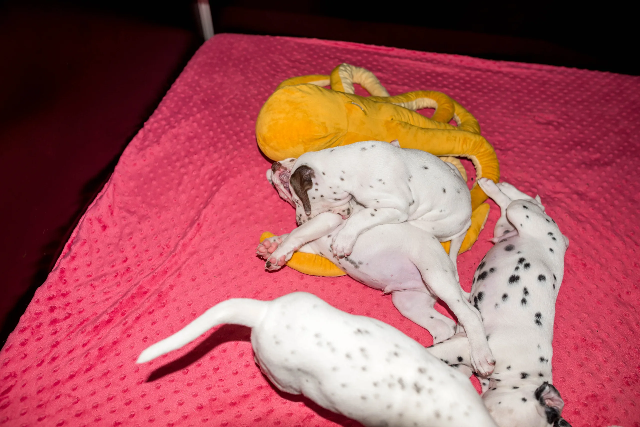 Im Schnitt wiegen alle aktuell um die dreieinhalb Kilogramm, nehmen täglich kontinuierlich und gleichmäßig zu. Ich bin eher ein Freund der restriktiven Fütterung, auch wenn das Wachstum an sich natürlich sehr kräfte- und energiezehrend ist. Sie sollen trotzdem nicht zu schnell zu schwer werden. So oder so erreichen alle ihr genetisch festgelegtes Endgewicht, selbst wenn sie nicht mit kugelrunden Bäuchen durchs Pfötchenparadies watscheln. In der Regel sind die Speckies nach den drei über den Tag verteilten Mahlzeiten hier noch ziemlich mobil, verspielt und munter. Abends bei der vierten Fütterung sind sie generell schon recht müde, da wird nur noch gekuschelt. Auch auf einen Ausflug folgt nach dem Futtern verständlicherweise ein direktes Schläfchen, sogar ohne Schmusebegleitung.