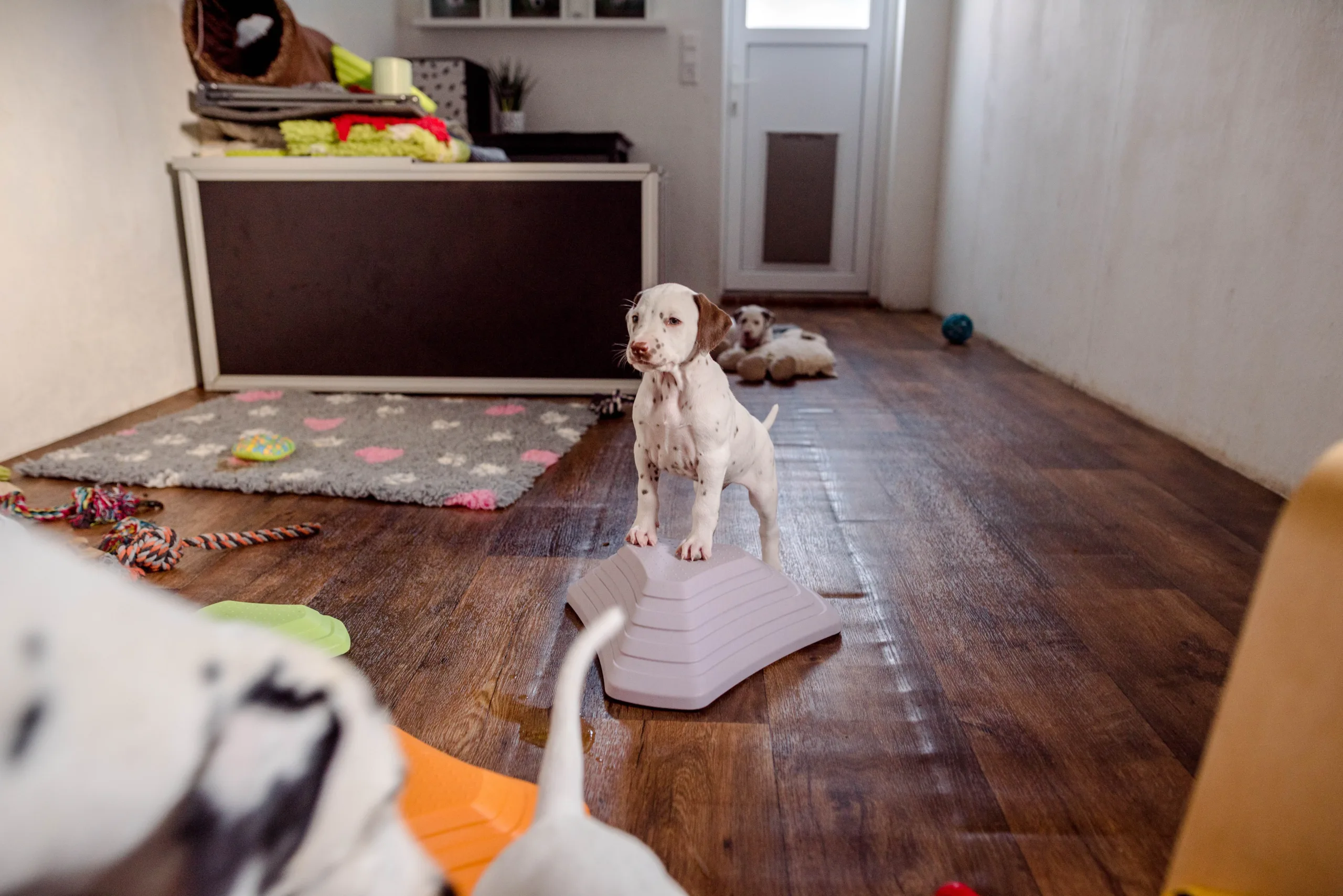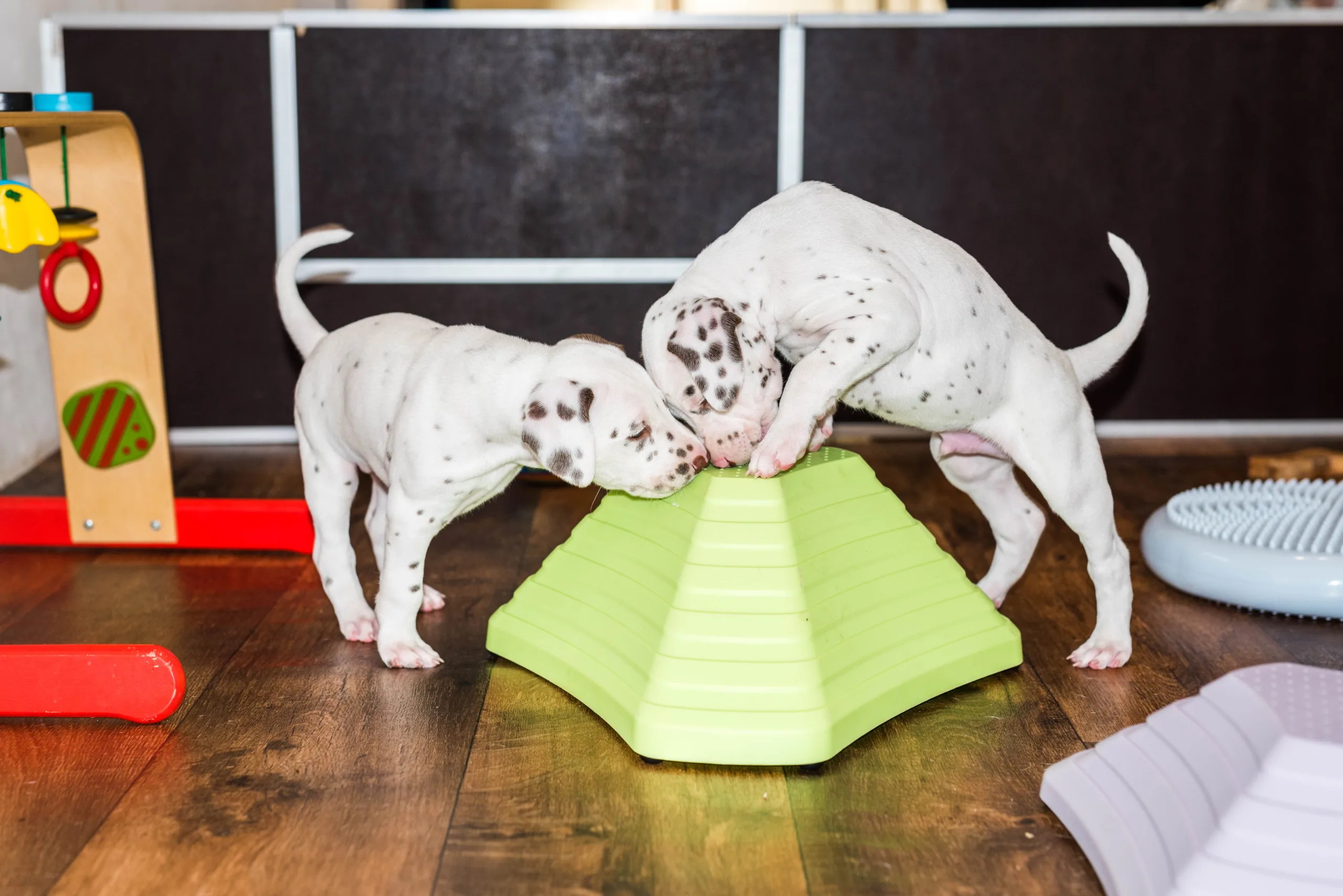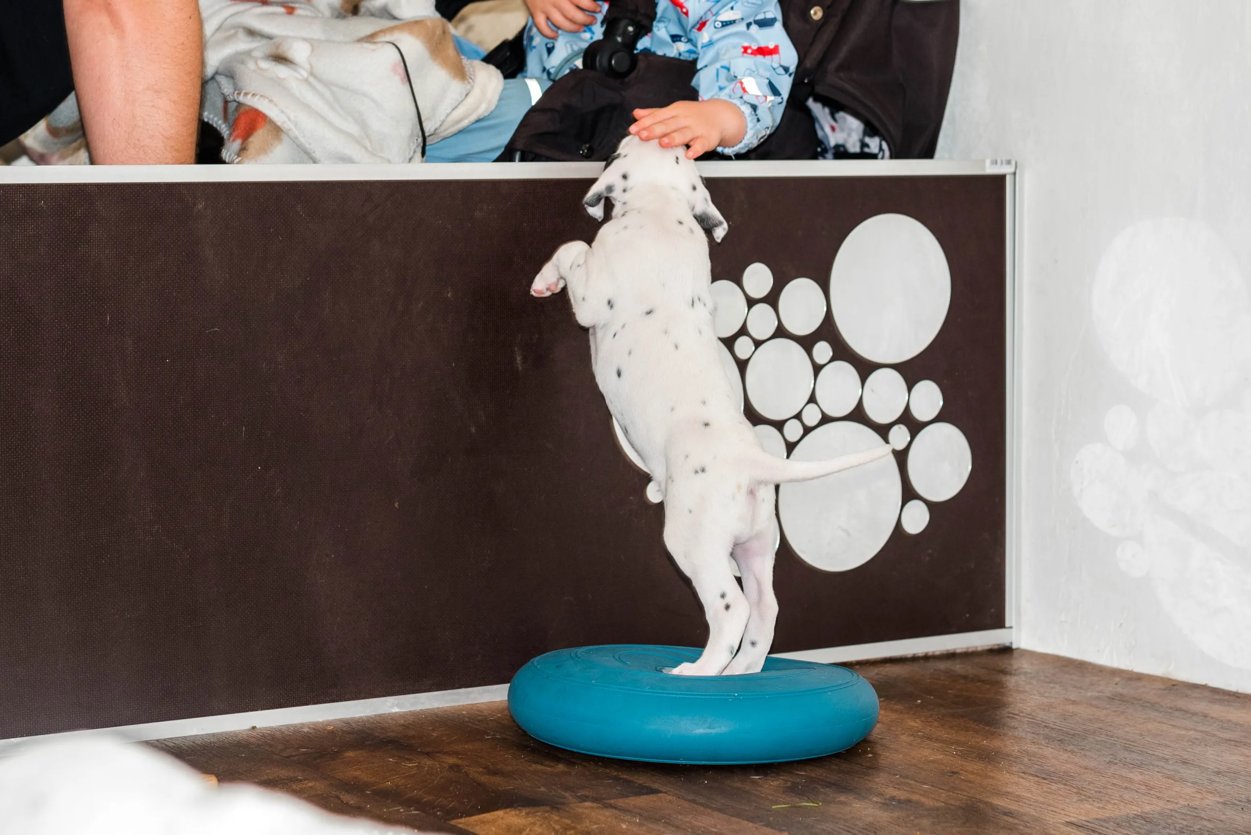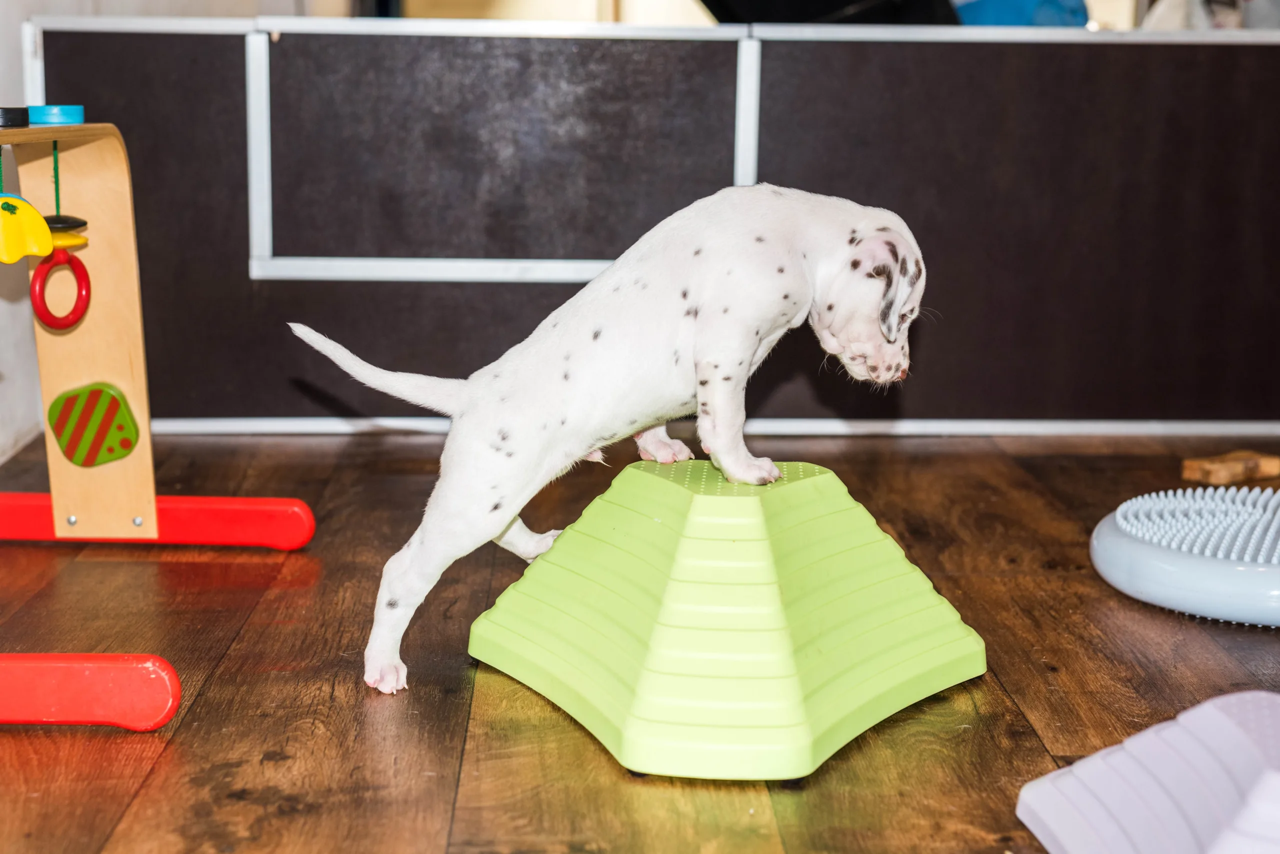 Gab es bisher nur flache Strukturmatten, laden nun auch höhere Hütchen die geschickten Gipfelstürmer zu Gleichgewichtsübungen ein. Außerdem müssen demnächst wohl das höhere Trennbrett einziehen, die ersten, eifrigen Kletterkünstler sind schon hartnäckig dabei, die bisherige Barriere zu erklimmen.