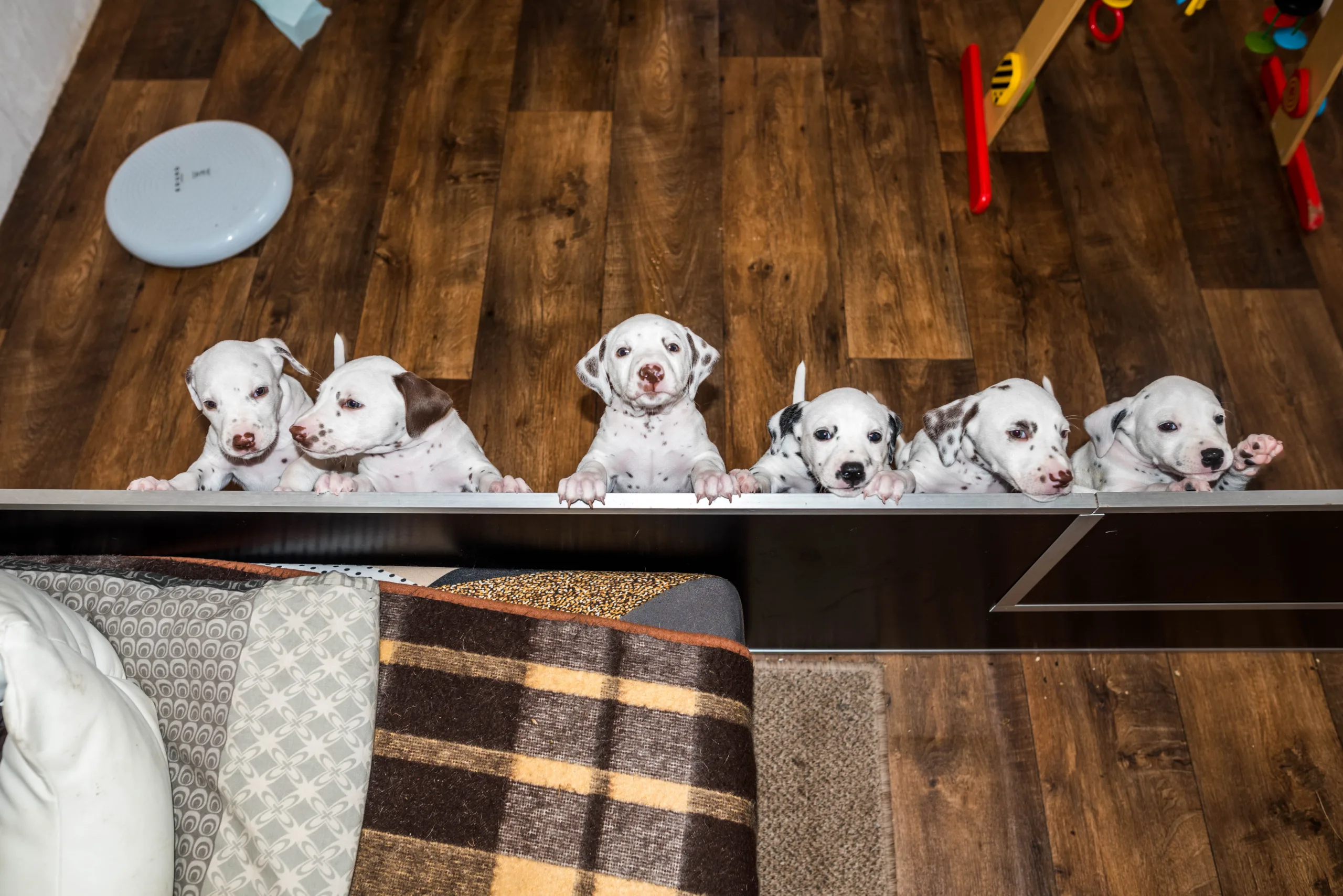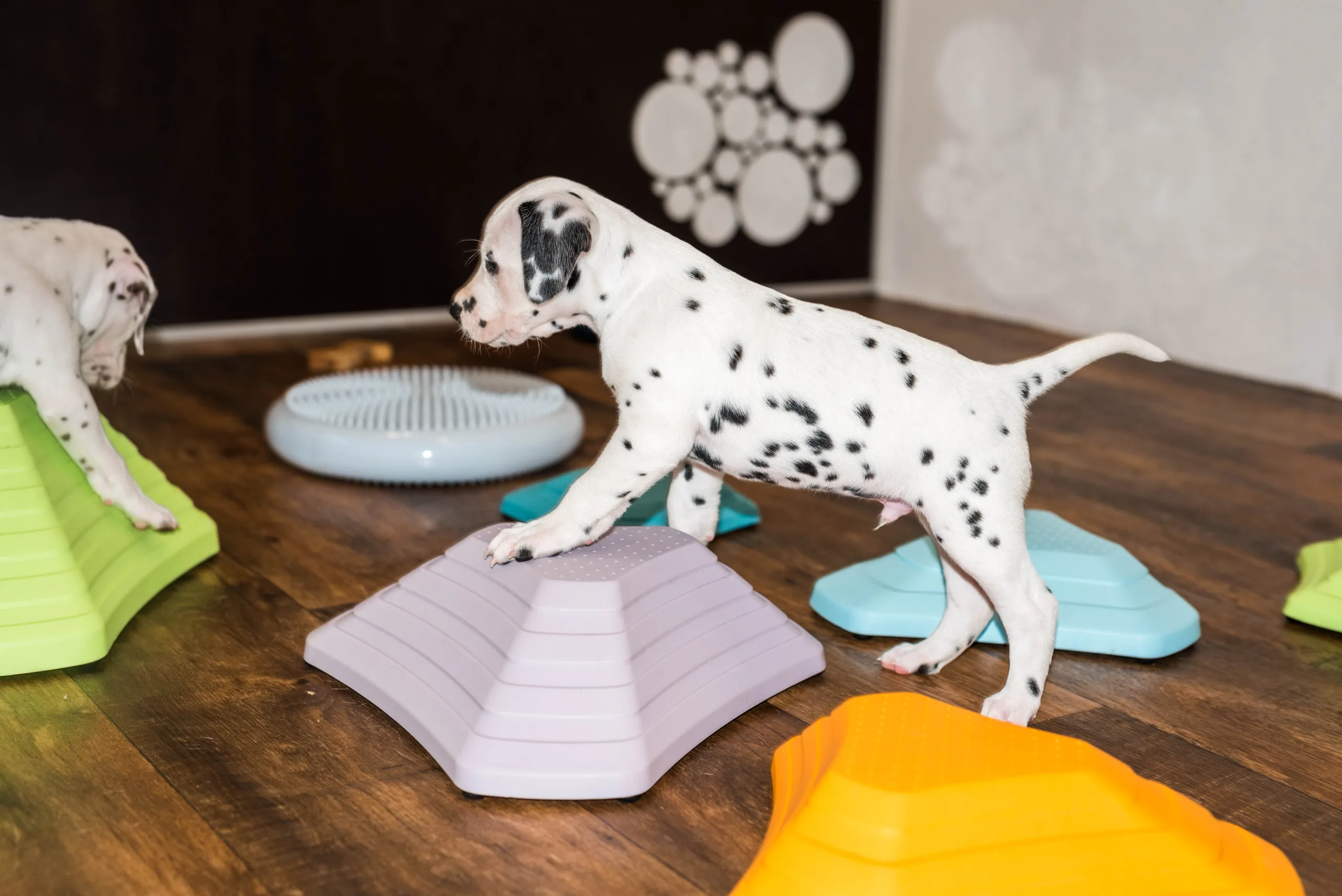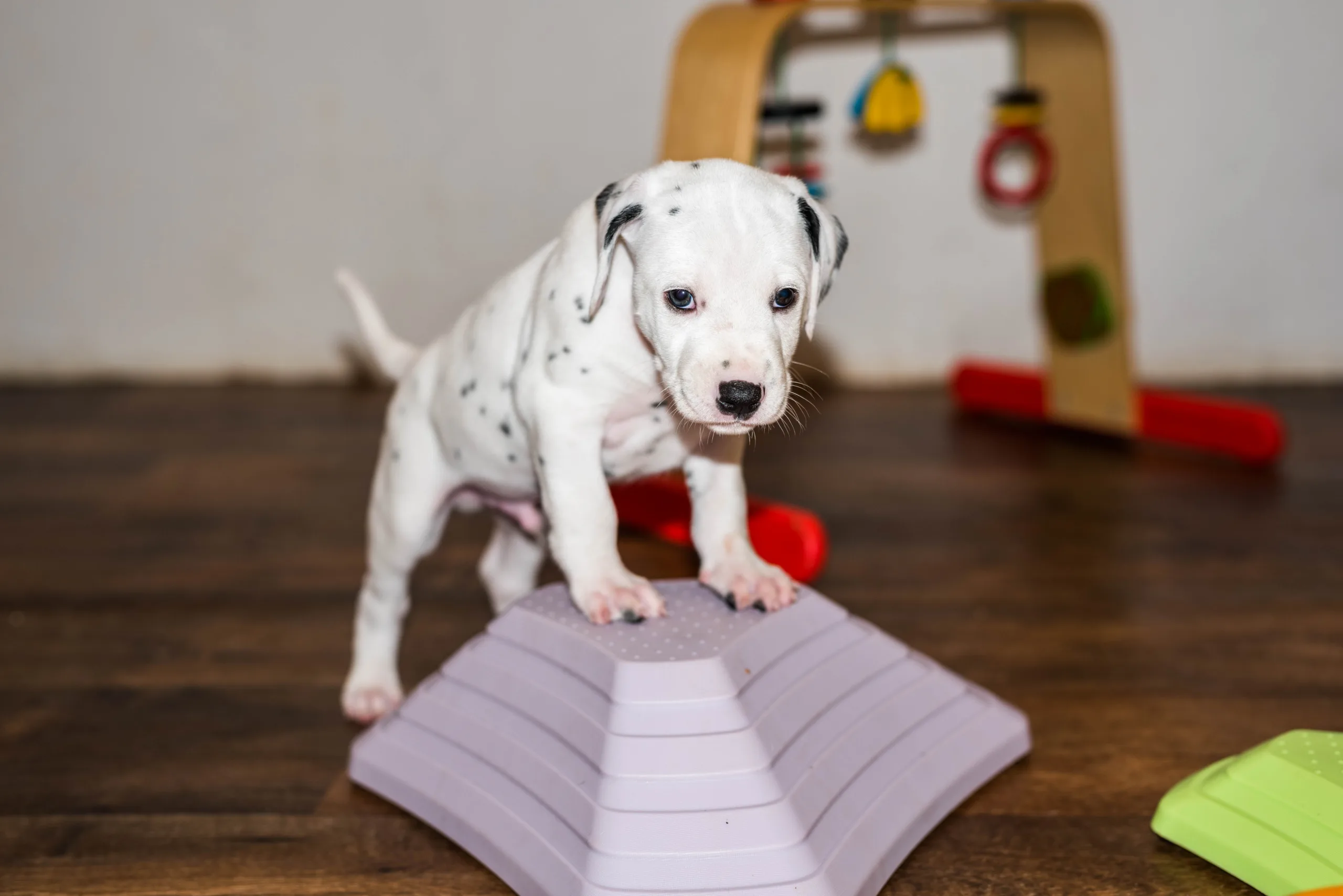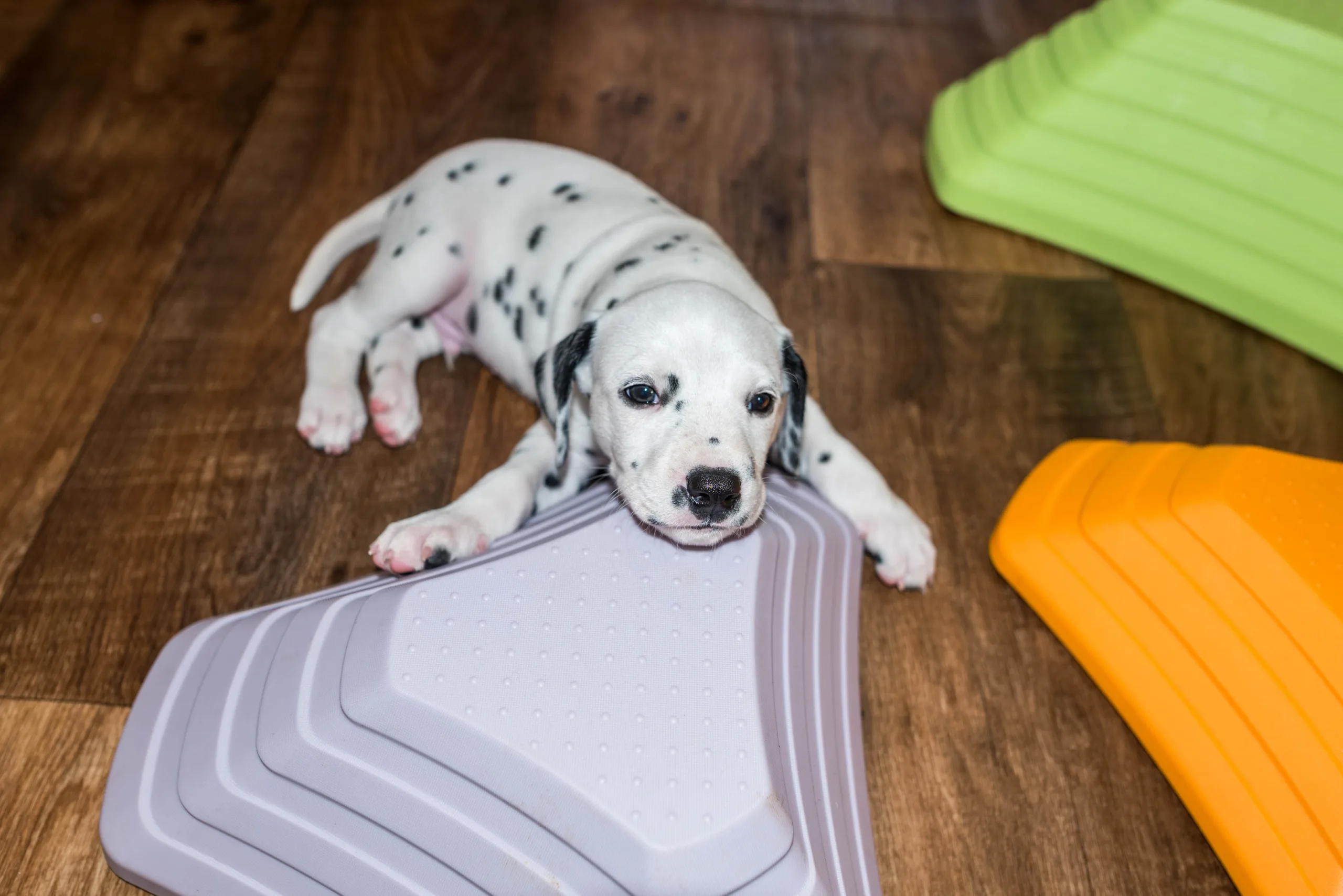 Gab es bisher nur flache Strukturmatten, laden nun auch höhere Hütchen die geschickten Gipfelstürmer zu Gleichgewichtsübungen ein. Außerdem müssen demnächst wohl das höhere Trennbrett einziehen, die ersten, eifrigen Kletterkünstler sind schon hartnäckig dabei, die bisherige Barriere zu erklimmen.