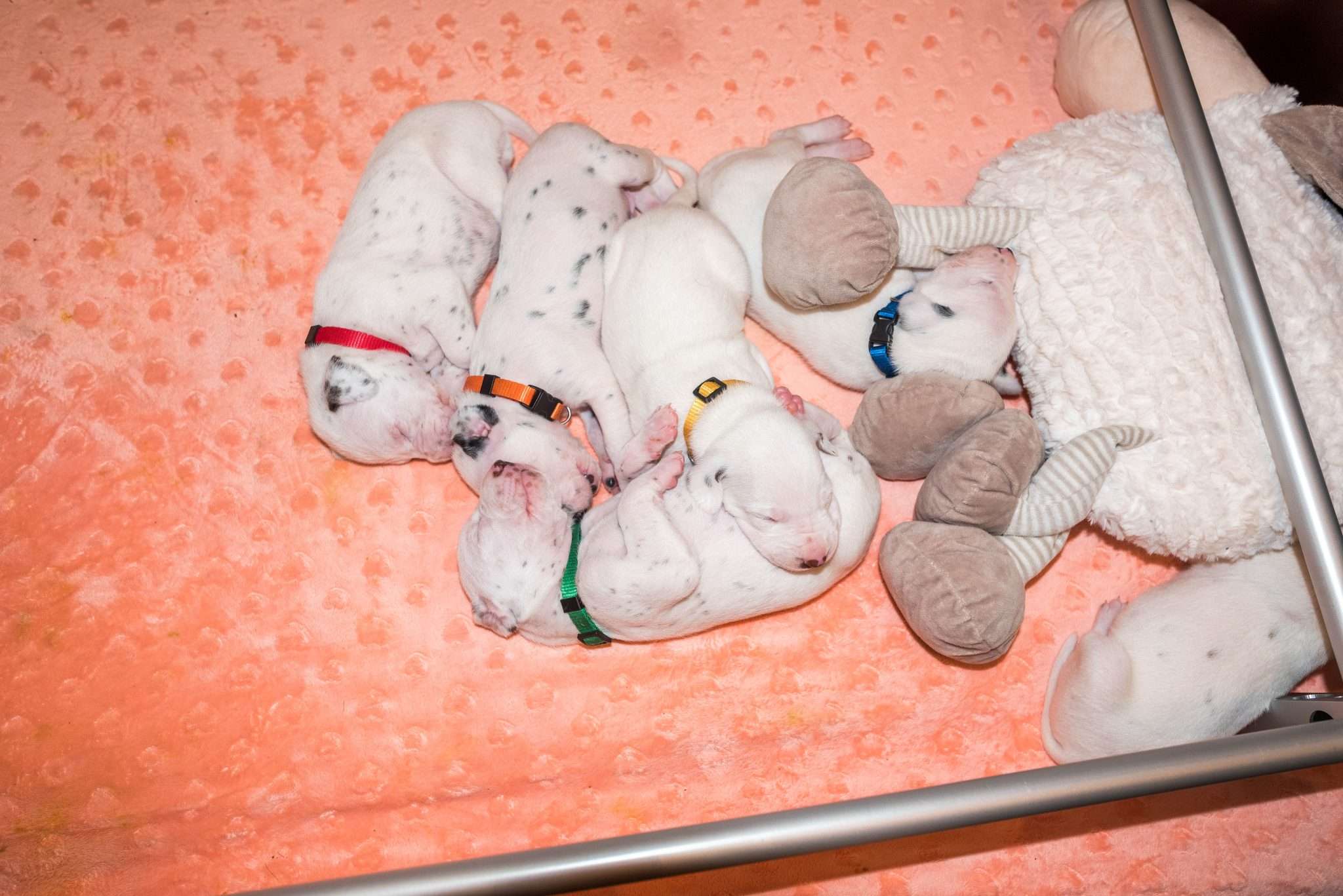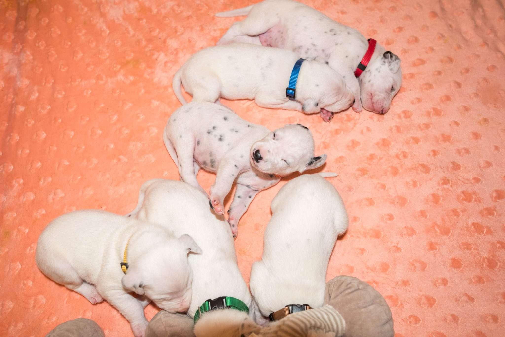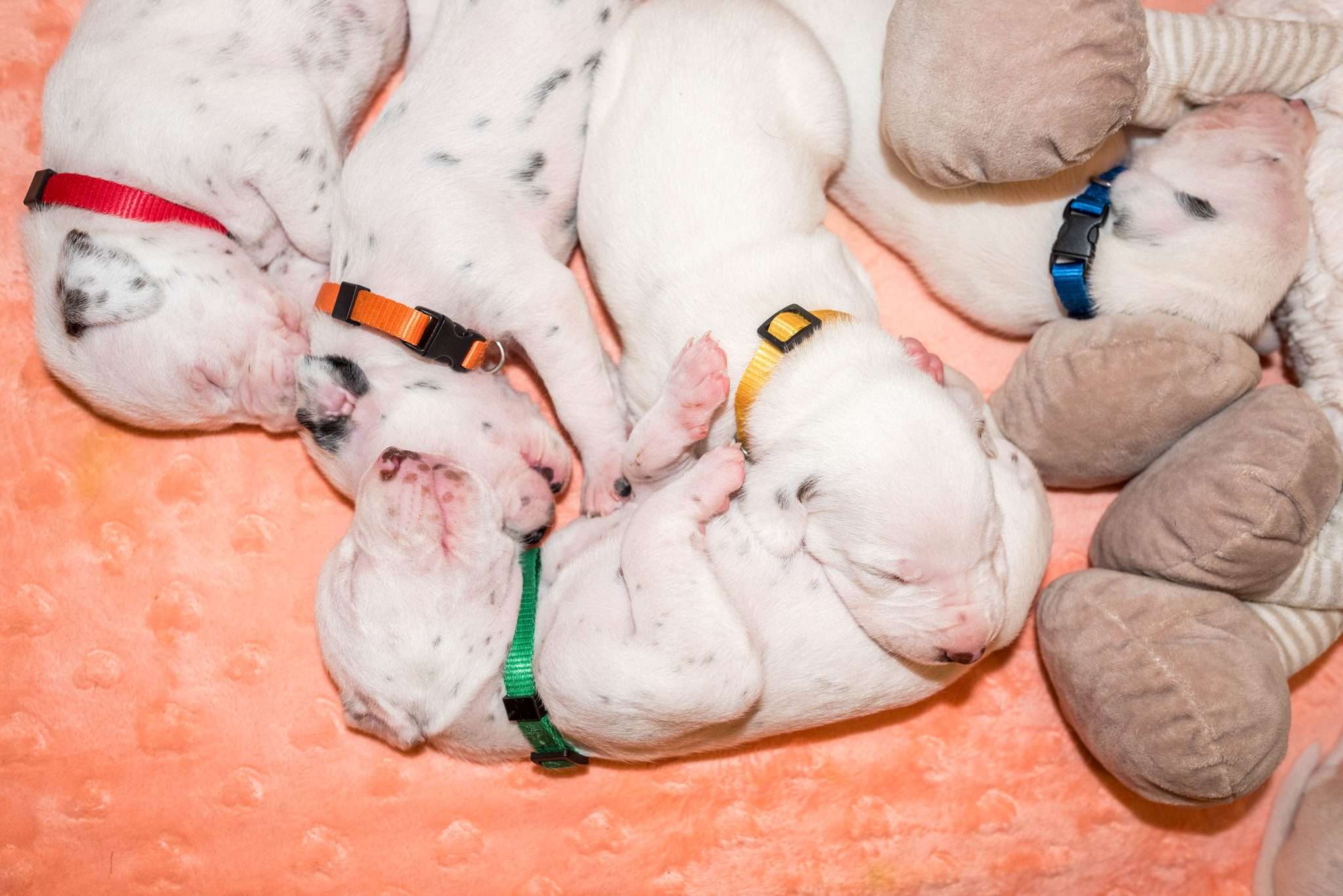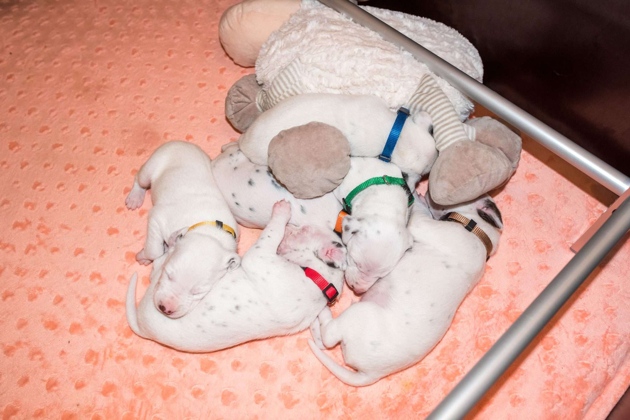 Ich weiß ehrlich gesagt gar nicht, ob eine Einzelbeschreibung dieser Woche sinnig ist, denn die Süßlinge präsentieren sich als geschlossener Haufen, ein wahnsinnig homogener Wurf. Nicht nur bei den Geburtsgewichten und der täglichen Zunahme – wobei sich die Verhältnisse an der Milchbar etwas verschoben haben und nun Herr Grün führt (erstaunlicherweise möchte ich betonen, denn am durchsetzungsstärksten präsentieren sich aktuell die Buben Rot, Orange und Gelb) – sondern vor allem charakterlich. Sie sind sich bisher so extrem ähnlich! Alle unfassbar entspannt, gemütlich, satt und im positiven Sinne wenig unterhaltsam, ich kann mich nur wiederholen. Sie scheinen absolut zufrieden zu sein, keiner meckert, keiner zetert, kaum mal wird irgendetwas gefordert und selbst Mama Dixi gönnen sie ihre verdienten Pausen.
