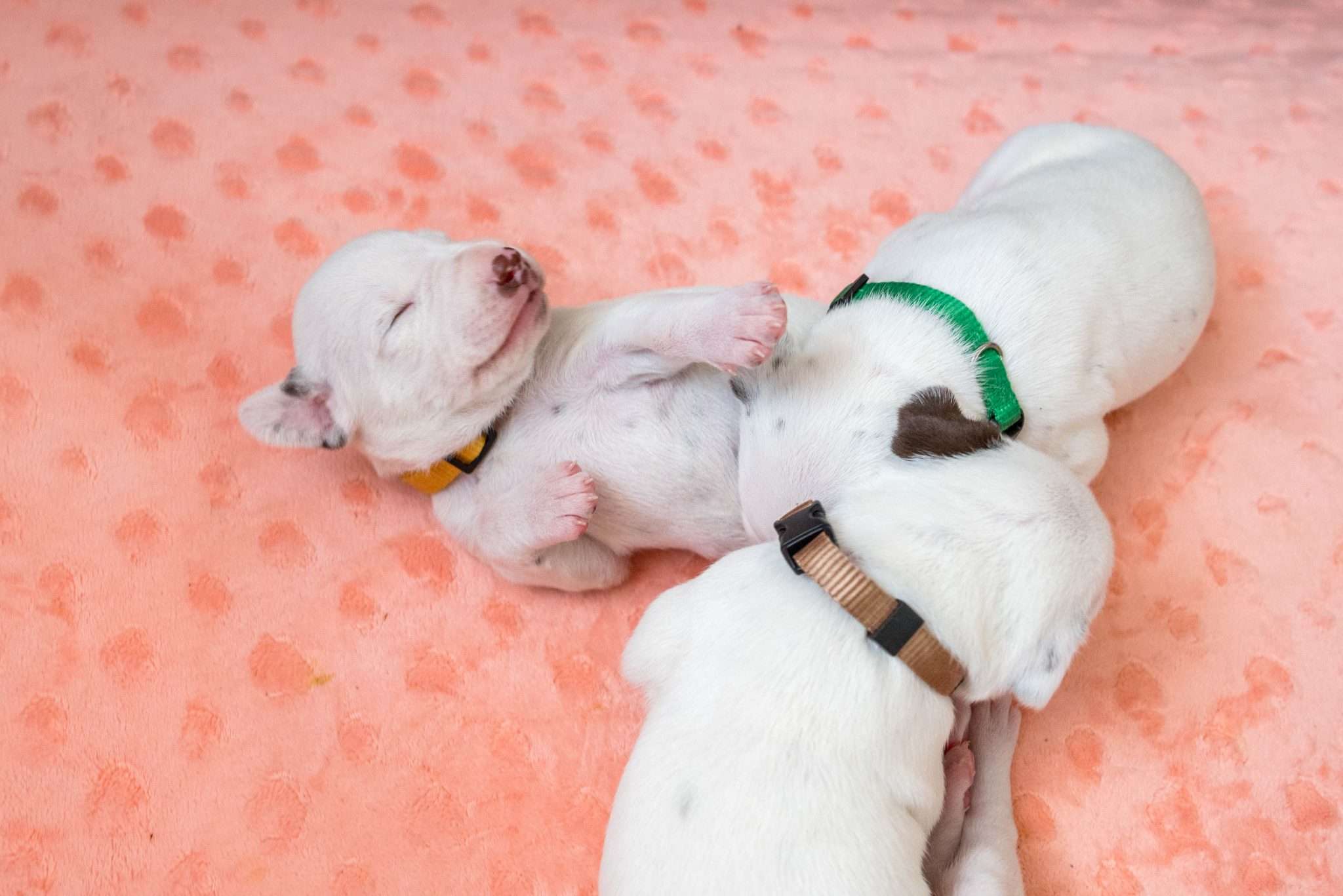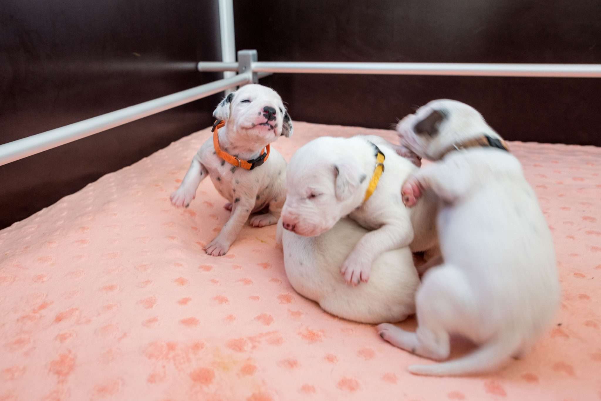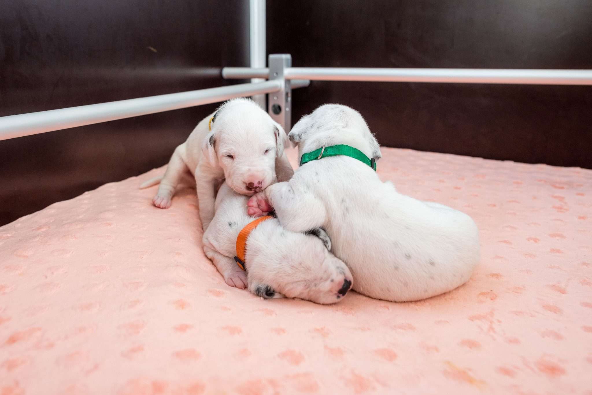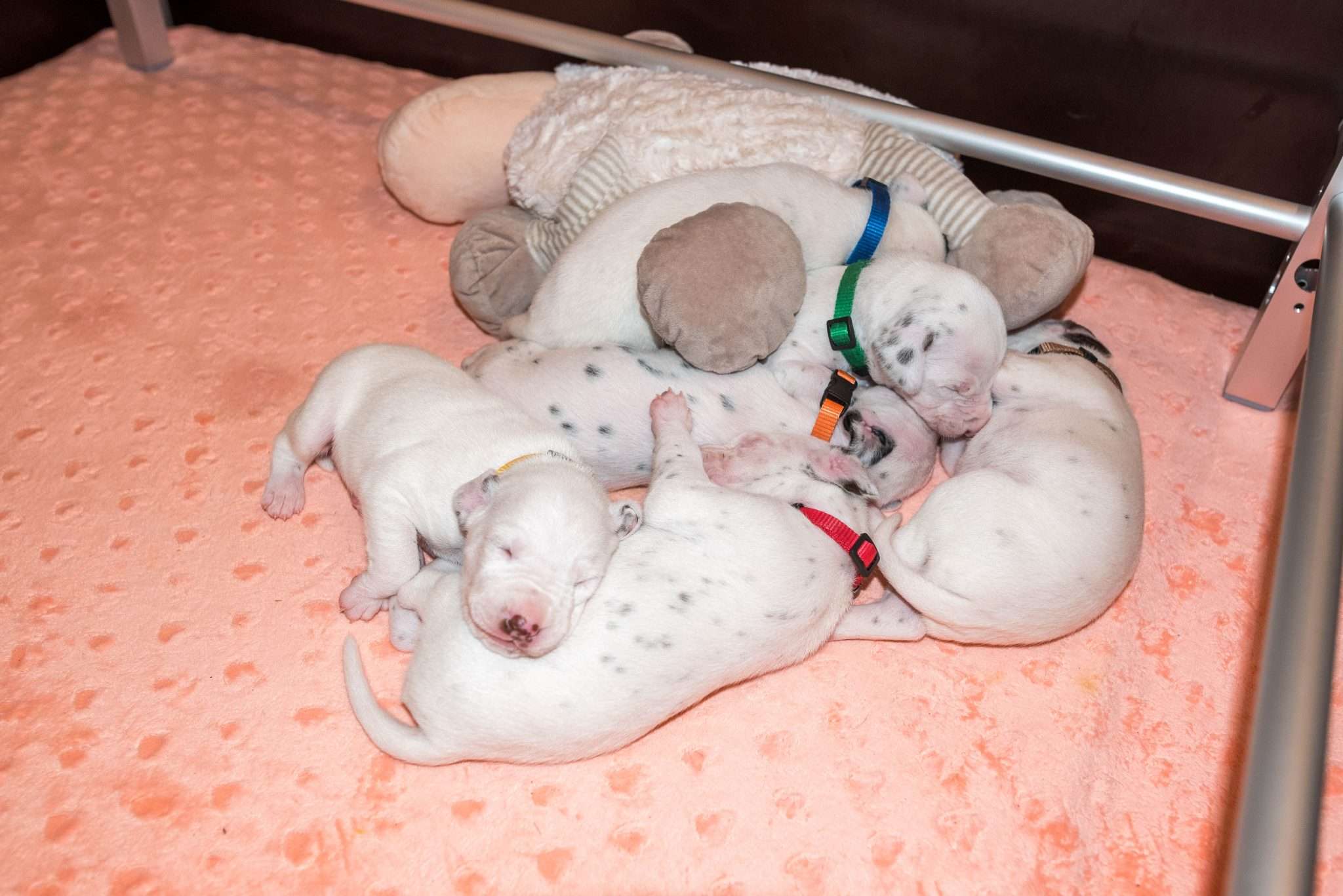 Ich weiß ehrlich gesagt gar nicht, ob eine Einzelbeschreibung dieser Woche sinnig ist, denn die Süßlinge präsentieren sich als geschlossener Haufen, ein wahnsinnig homogener Wurf. Nicht nur bei den Geburtsgewichten und der täglichen Zunahme – wobei sich die Verhältnisse an der Milchbar etwas verschoben haben und nun Herr Grün führt (erstaunlicherweise möchte ich betonen, denn am durchsetzungsstärksten präsentieren sich aktuell die Buben Rot, Orange und Gelb) – sondern vor allem charakterlich. Sie sind sich bisher so extrem ähnlich! Alle unfassbar entspannt, gemütlich, satt und im positiven Sinne wenig unterhaltsam, ich kann mich nur wiederholen. Sie scheinen absolut zufrieden zu sein, keiner meckert, keiner zetert, kaum mal wird irgendetwas gefordert und selbst Mama Dixi gönnen sie ihre verdienten Pausen.