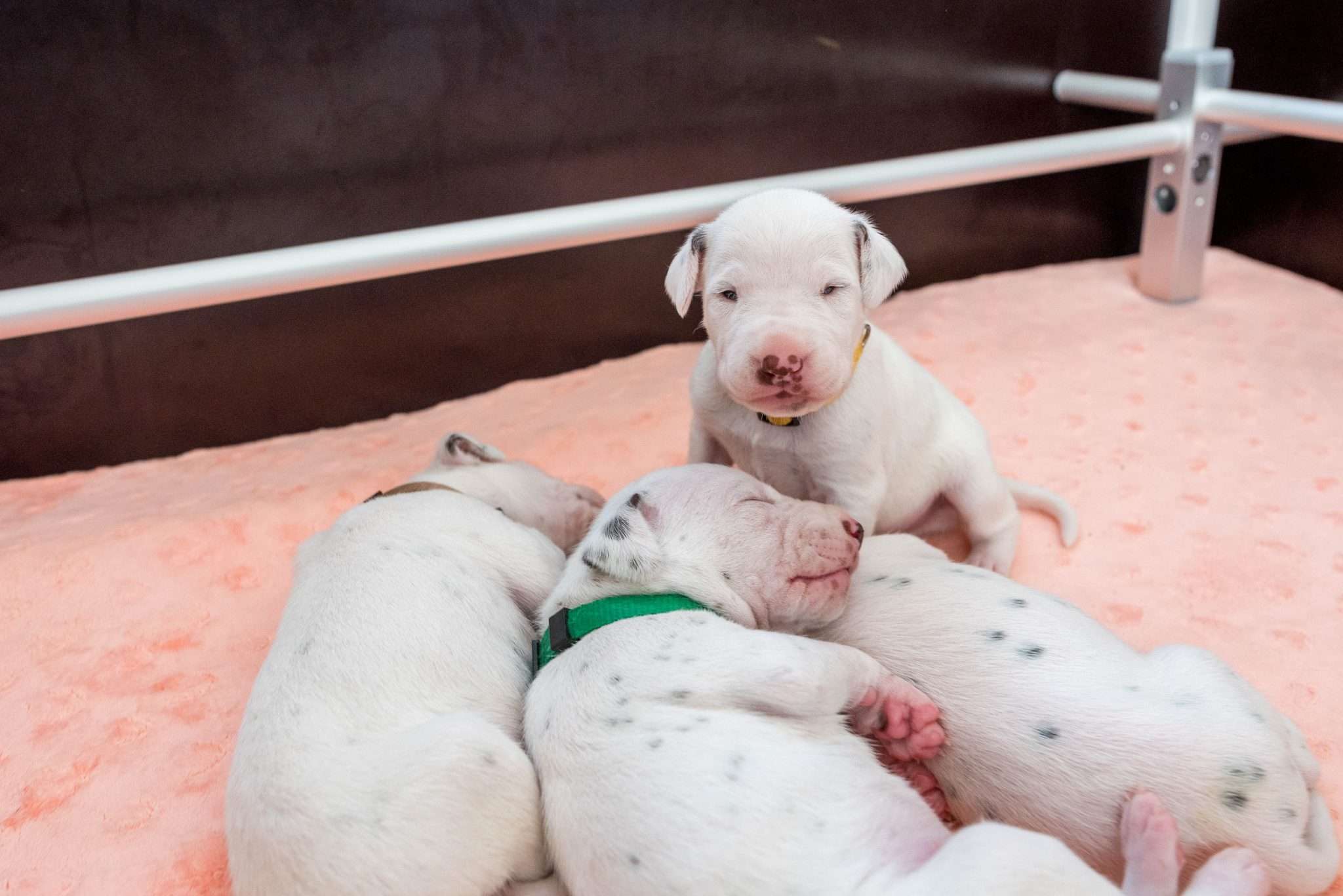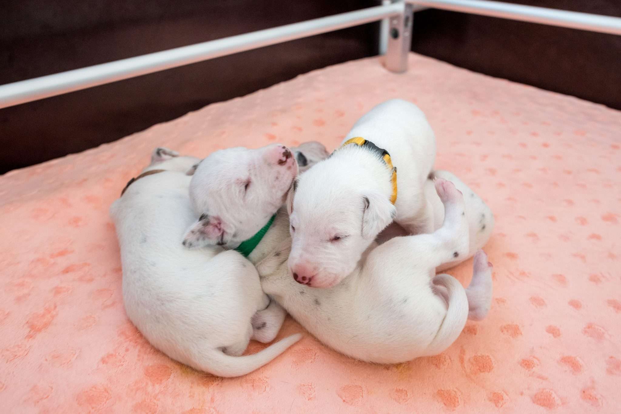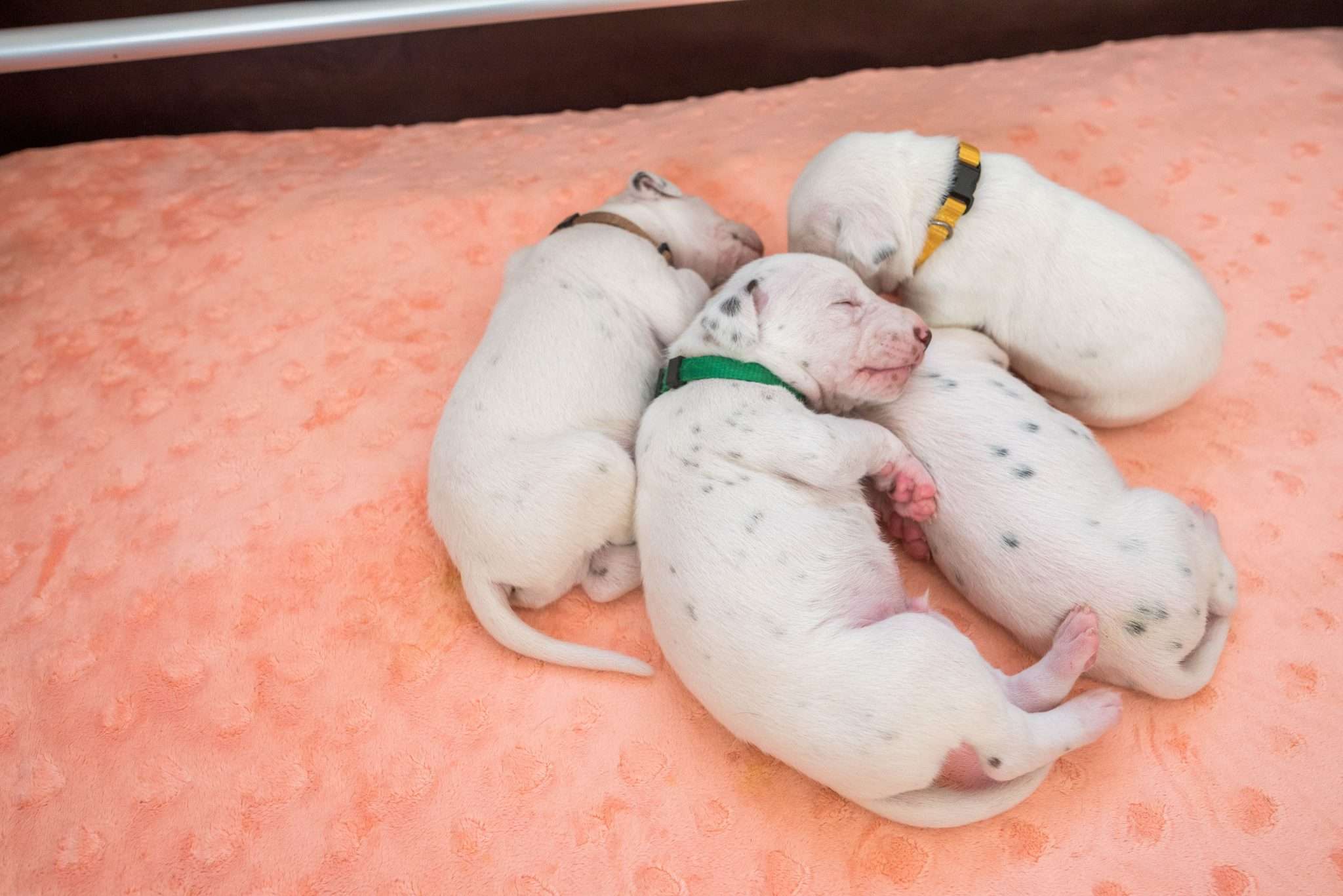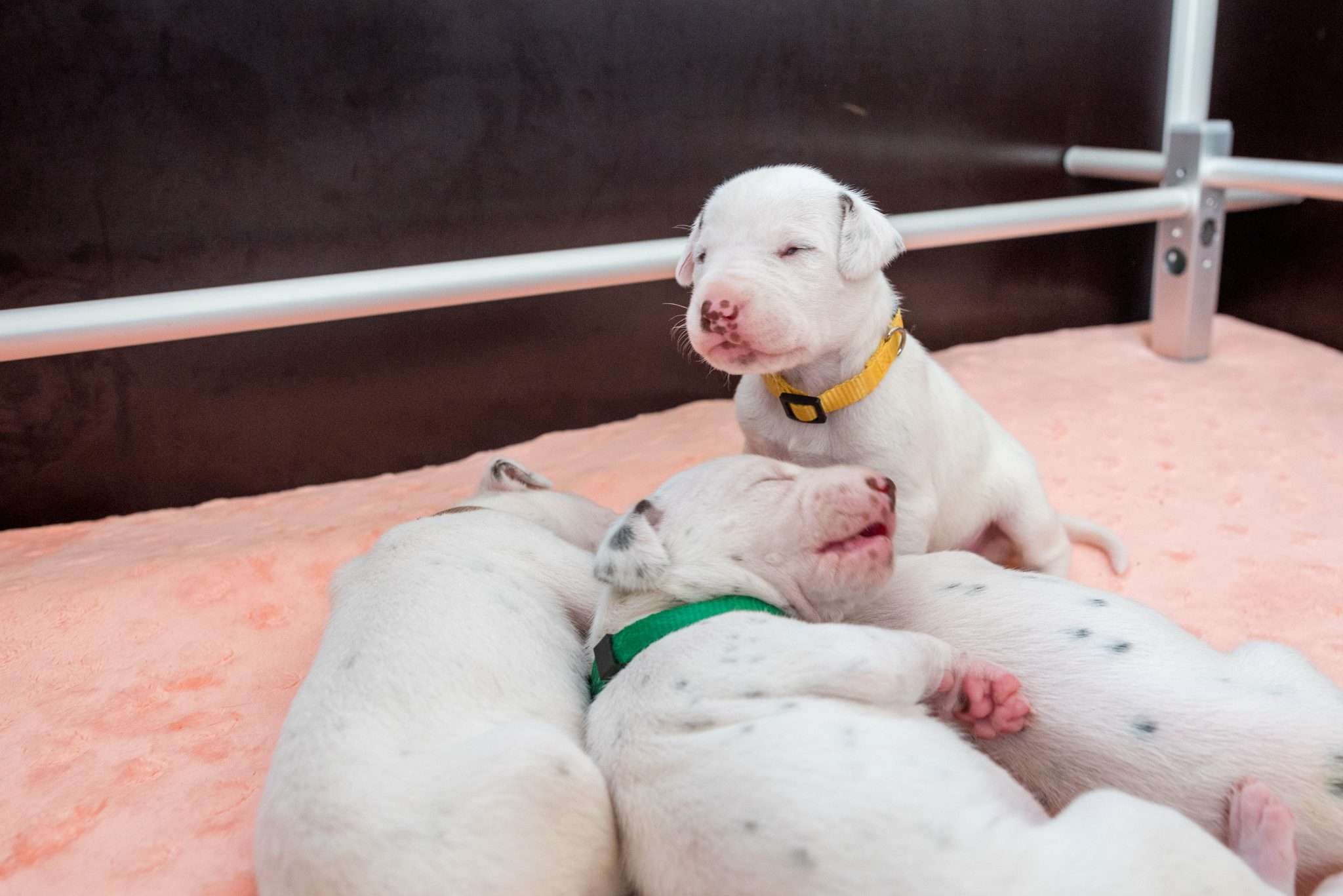 Ich weiß ehrlich gesagt gar nicht, ob eine Einzelbeschreibung dieser Woche sinnig ist, denn die Süßlinge präsentieren sich als geschlossener Haufen, ein wahnsinnig homogener Wurf. Nicht nur bei den Geburtsgewichten und der täglichen Zunahme – wobei sich die Verhältnisse an der Milchbar etwas verschoben haben und nun Herr Grün führt (erstaunlicherweise möchte ich betonen, denn am durchsetzungsstärksten präsentieren sich aktuell die Buben Rot, Orange und Gelb) – sondern vor allem charakterlich. Sie sind sich bisher so extrem ähnlich! Alle unfassbar entspannt, gemütlich, satt und im positiven Sinne wenig unterhaltsam, ich kann mich nur wiederholen. Sie scheinen absolut zufrieden zu sein, keiner meckert, keiner zetert, kaum mal wird irgendetwas gefordert und selbst Mama Dixi gönnen sie ihre verdienten Pausen.