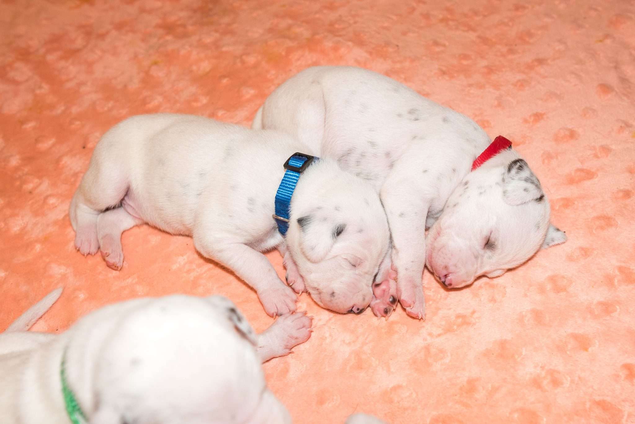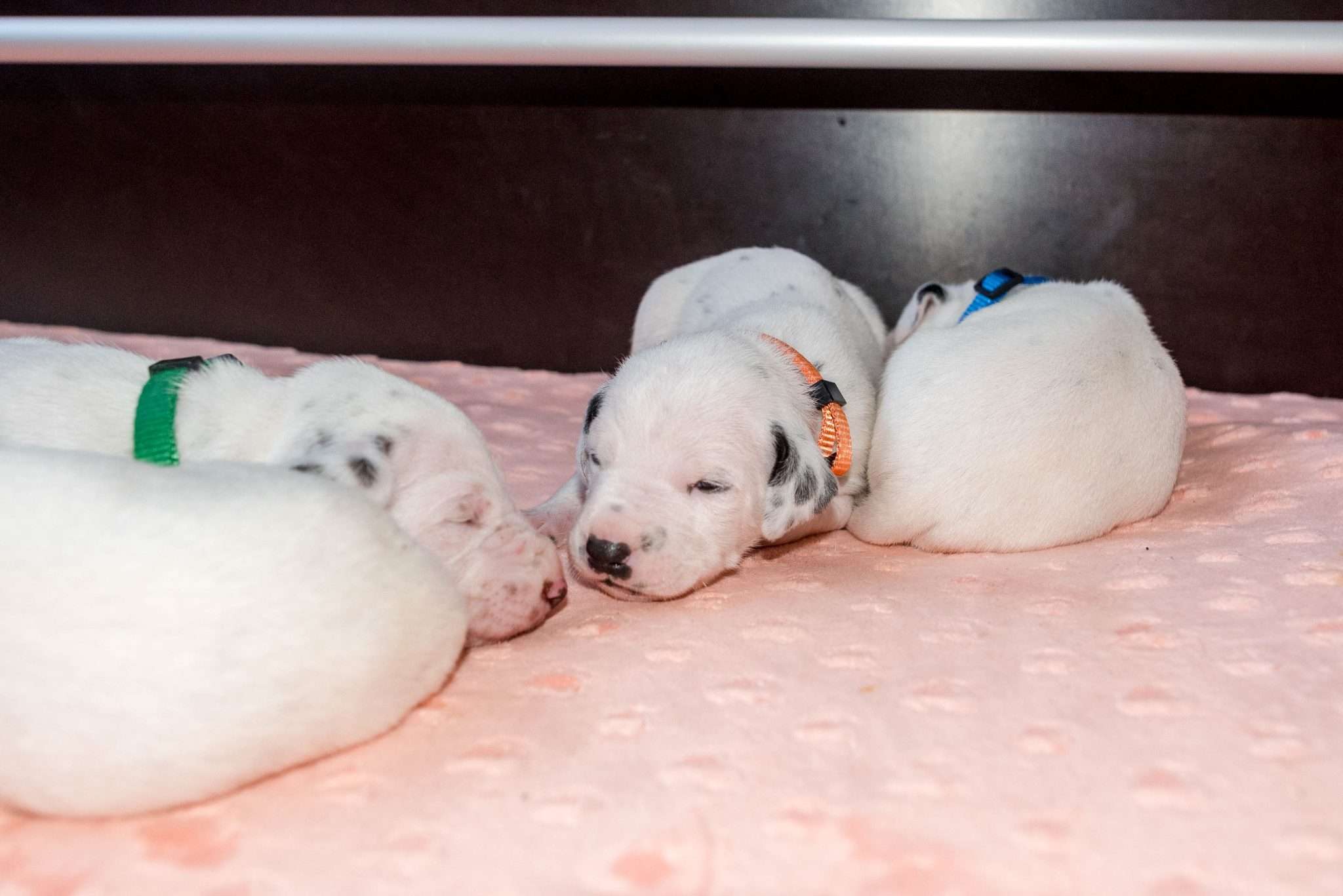 Die Schritte werden immer koordinierter und vor allem die schwarz getupften Jungs, die als Erste die Glubscher geöffnet haben, sind schon auffallend zielstrebig und fidel unterwegs, während Herr Braun, der seine hübschen Äuglein immer noch weitestgehend bedeckt hält, einen kleinen strategischen Nachteil hat. Die Bewegungen gefallen mir bei allen. Zwar sind sie noch etwas wackelig auf den Beinen, die Gehversuche werden aber immer gekonnter und aktuell erscheint mir glücklicherweise keiner neurologisch auffällig. Alles entwickelt sich genauso wie es soll und es ist kaum zu fassen, was in den letzten wenigen Tagen für Entwicklungsschritte durchlaufen wurden. Die Speckies haben damit (zumindest theoretisch, wenn sie denn wollen) diese hochgradig vegetative Phase aus Schlafen-Fressen-Schlafen hinter sich gelassen. Im Grunde befinden sich die Schnarchnasen aber in einem Dauerentspannungszustand, wenn sie an der Milchbar nicht gerade zu ausgehungerten Piranhas mutieren. Noch kann ich sie daher ganz gut in der Wurfbox halten, wenngleich die Grenzen des Lagers doch hin und wieder neugierig ausgekundschaftet werden.