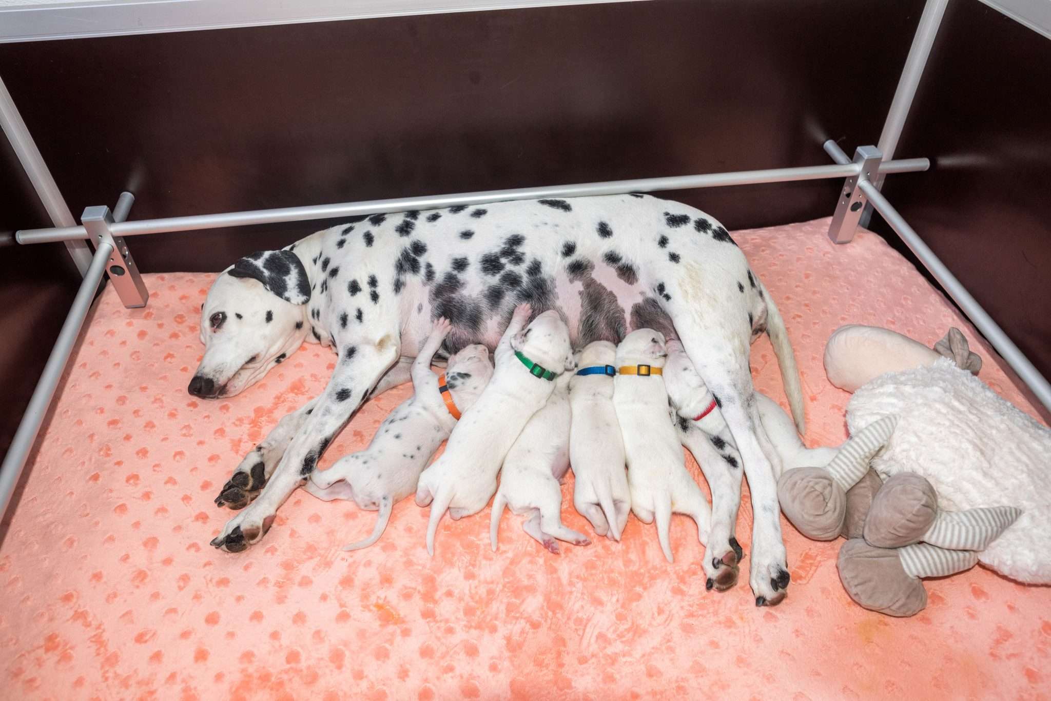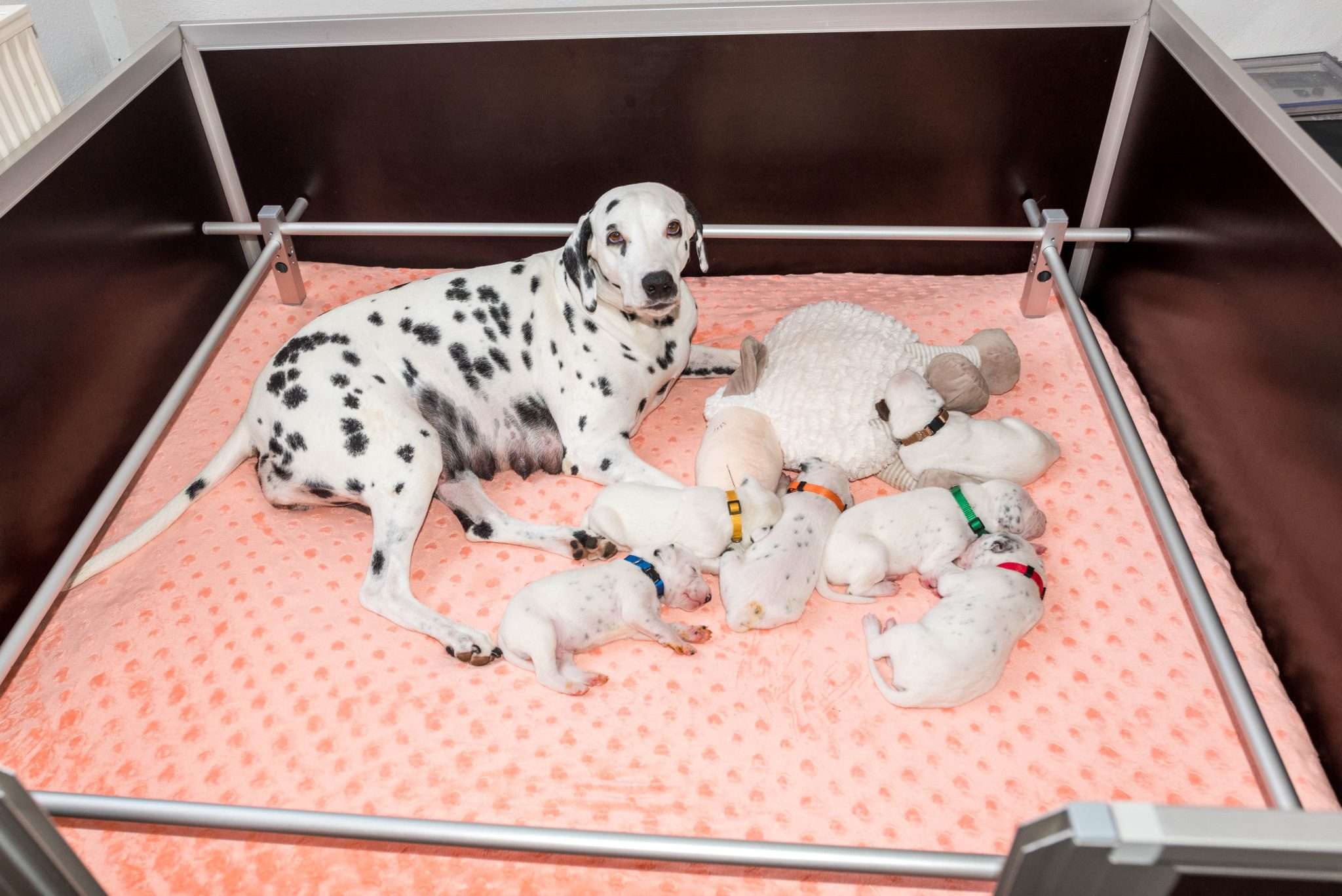 Ein Mal mehr bin ich dankbar dafür, dass alles so problemlos läuft und auch unsere Nächte bereits ziemlich ruhig sind. Dixi ist eine wundervolle Mama und verdient meinen größten Respekt. Würde sie das nicht so souverän rocken, wäre diese Zeit nicht so sorgenfrei. Sie kümmert sich rührend um ihre Welpen, pflegt das Fell, regt die Verdauung an und hält das Lager sauber. Nach dem regelmäßigen Füttern genießt sie ihre wohlverdiente Auszeit aber lieber auf dem Bett neben der Wurfbox statt darin. Von dort aus hat sie einen hervorragenden Überblick, wird aber nicht ständig überfallen und kann unbeschwert dösen und Kräfte sammeln für alles, was noch kommen wird. Ich bin so, so stolz auf sie und froh darüber, in ihr so eine instinktsichere Mama zu haben.