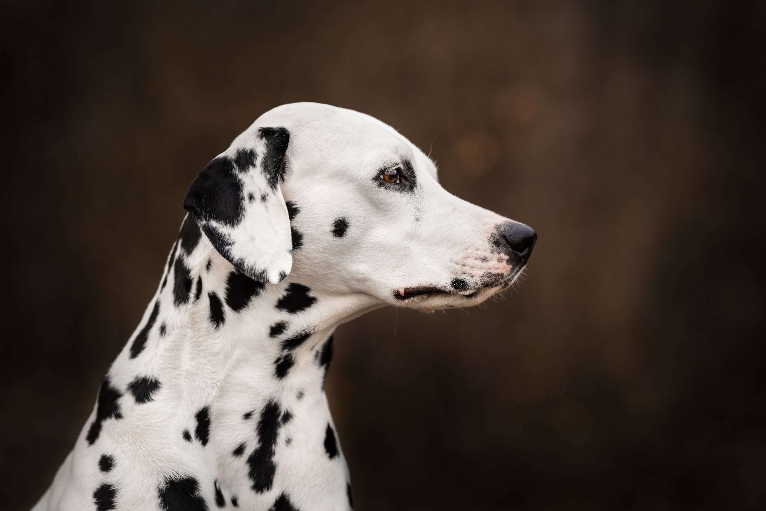 Alvas Fleckung ist mittelstark, gleichmäßig verteilt, rund und klar abgegrenzt, das Pigment lackschwarz und satt. Über die Jahre sind lediglich ein paar kleine Glückspünktchen hinzugekommen. Ihr Augen sind mittelbraun und der Augen- sowie Nasensaum komplett durchpigmentiert.
